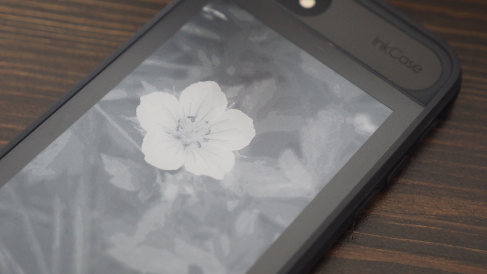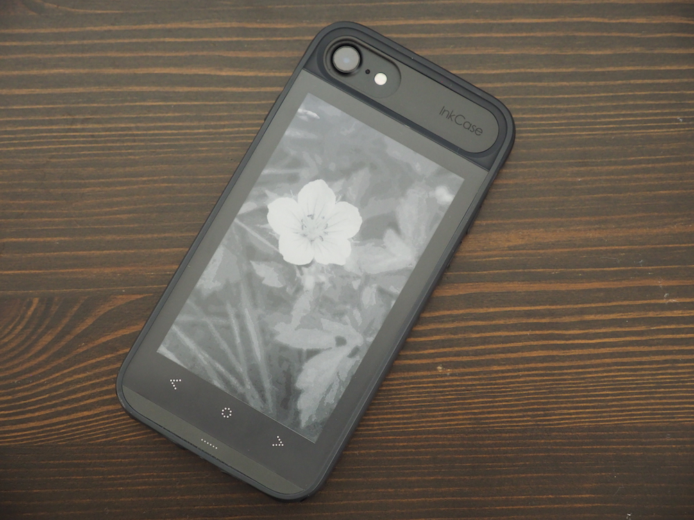 「InkCase i7」ケース側で操作すれば、簡単に画像を変更できます。表示された画像は、よくよく見ればガビガビと解像度の粗さが分かってしまいますが、ケースの柄として表示させるのには十分です。
