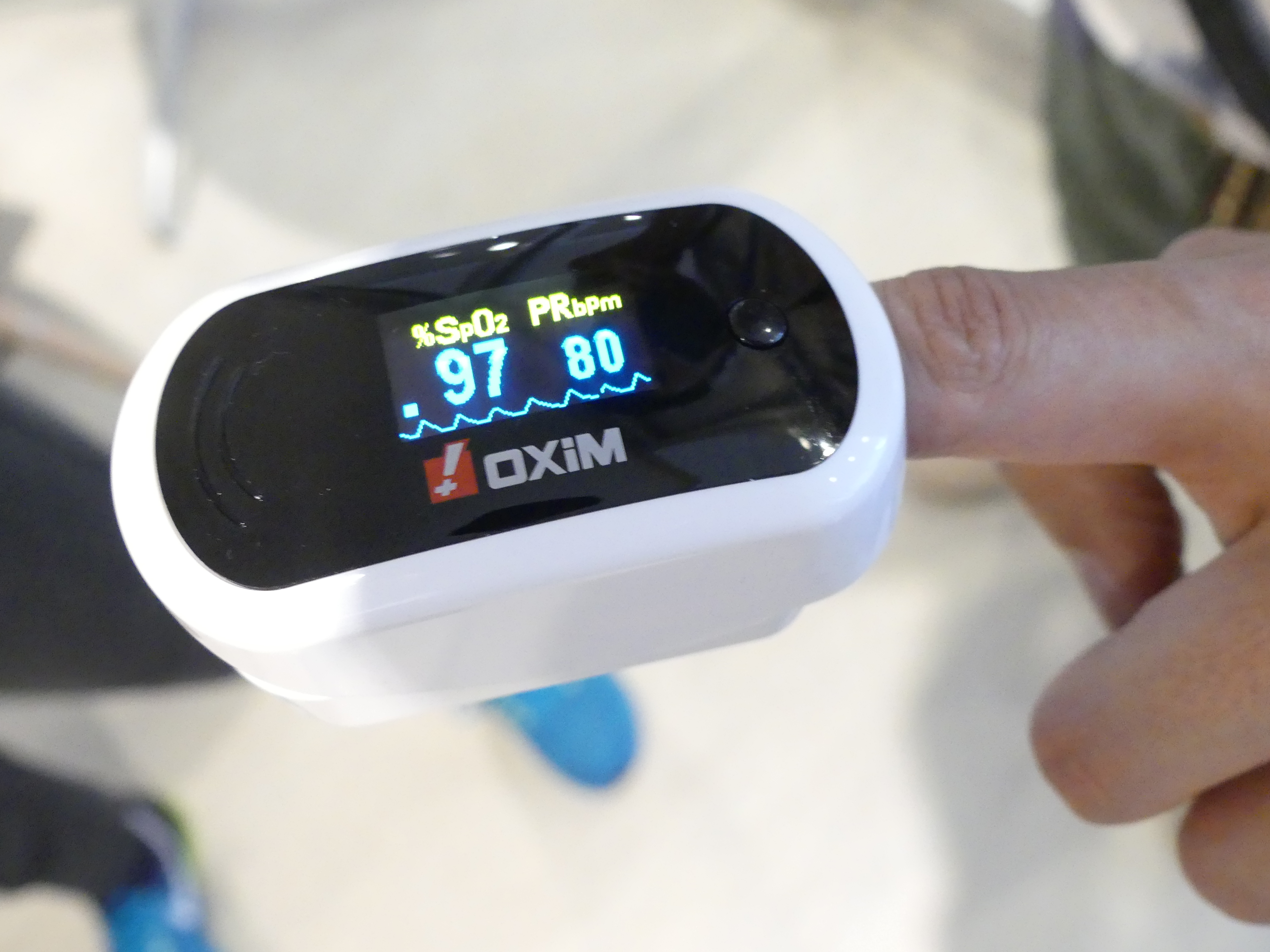 プログラム終了後、すかさず再び数値を計測。プログラム前は“97”だったSpO2が、何と“81”まで落ちています。もも上げで追い込んだときはビタイチ変わらなかった数値が、一気に16も低下。プログラムの最中にキツい、シンドいと感じるようなハードな運動はひとつもなかったのですが、カラダは激しいトレーニングだと認識して反応しているようです。