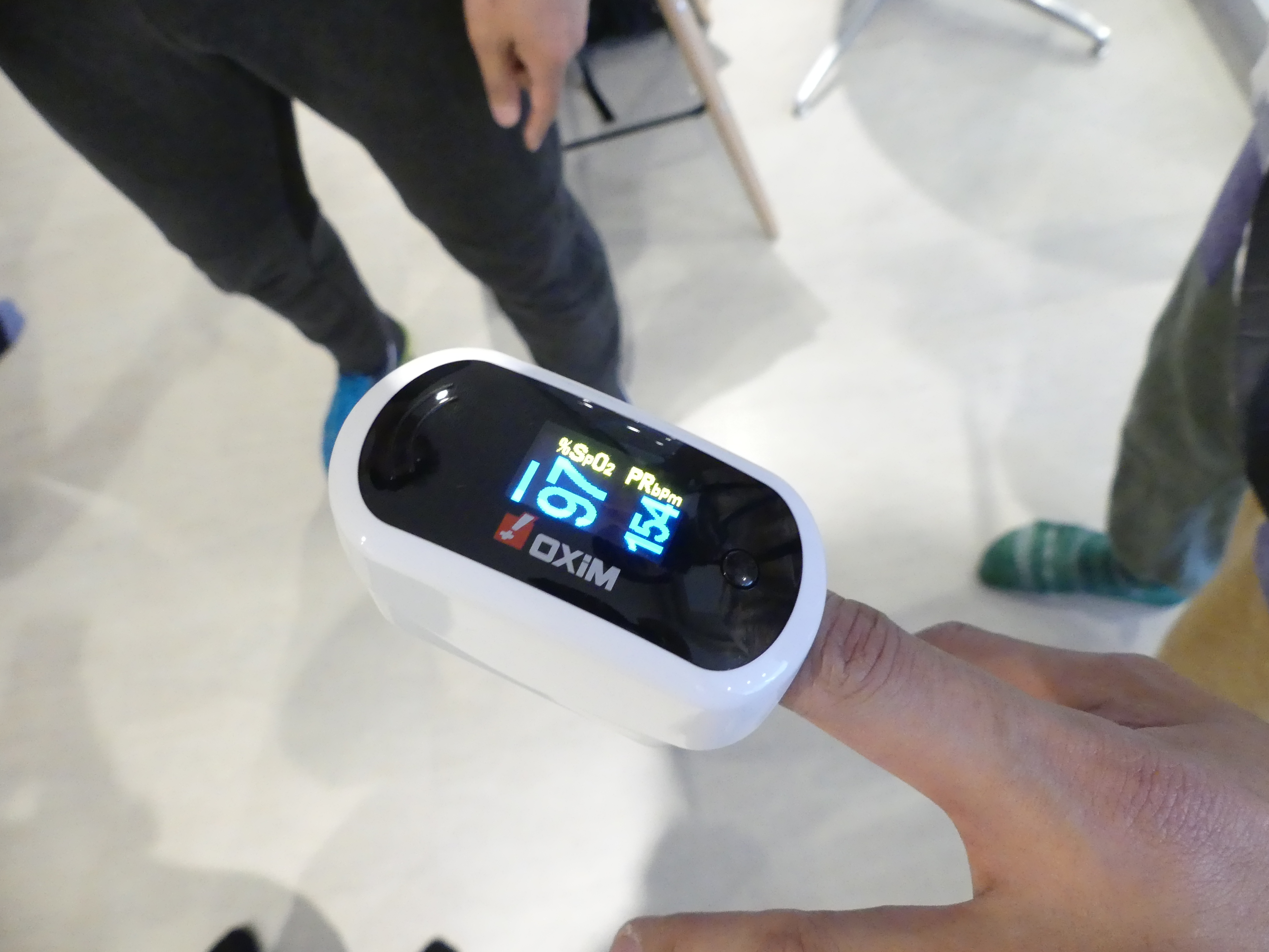 右の「80(bpm)」は脈拍数、左の「97(SpO2)」は経皮的動脈血酸素飽和度です。注目してもらいたいのは左の“97”。「動脈血中のヘモグロビンが酸素と結合している割合」を示していますが、ここではSpO2が下がるほど“息切れ状態”にあると思っておいてください。つまり、運動後にこの数値が下がれば、「息切れするほど、めっちゃ激しく運動しましたね!」ということを知る、ひとつの目安になるということです。