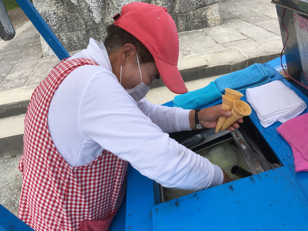 ▲屋台内の保冷庫からアイスをヘラですくって…コーンの上に盛り付ける