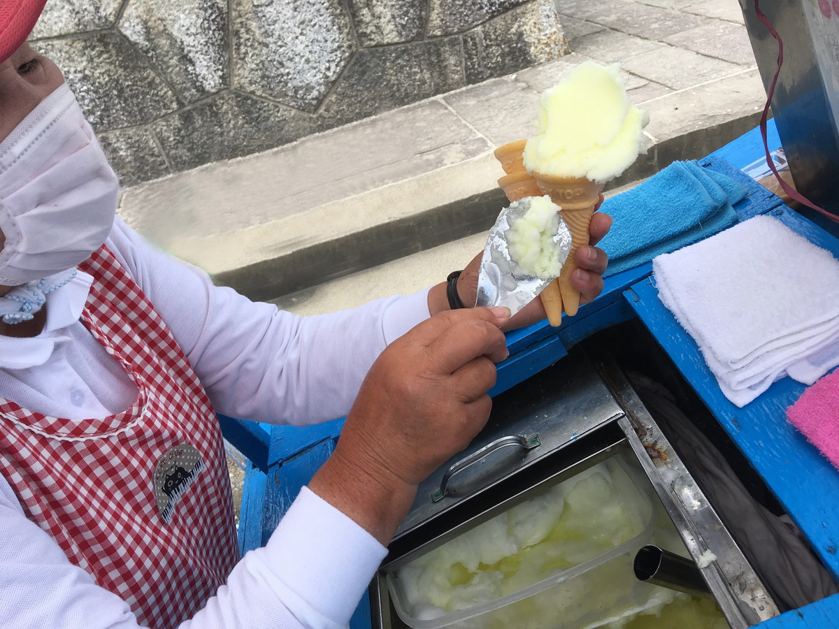 食感はシャーベットに近い「シャリシャリ」とした感じ。でも氷の粒は小さく、口の中に入れるとスッと溶ける。舌で軽くすくうことができるほど、やわらかい口当たりです。そして味はすごくシンプル。クリームなど乳脂肪分は入っておらず、とてもさっぱりした甘みが特徴。屋台のオバちゃんが言うには「バナナっぽい味がするという人もいるよ~」とのこと。確かにバナナフレーバーが鼻に抜けるが、ほんのりといった具合。とにかく優しい味。甘さも控えでべたつかないので、蒸し暑い日にもスーッと身体の中に入っていく。