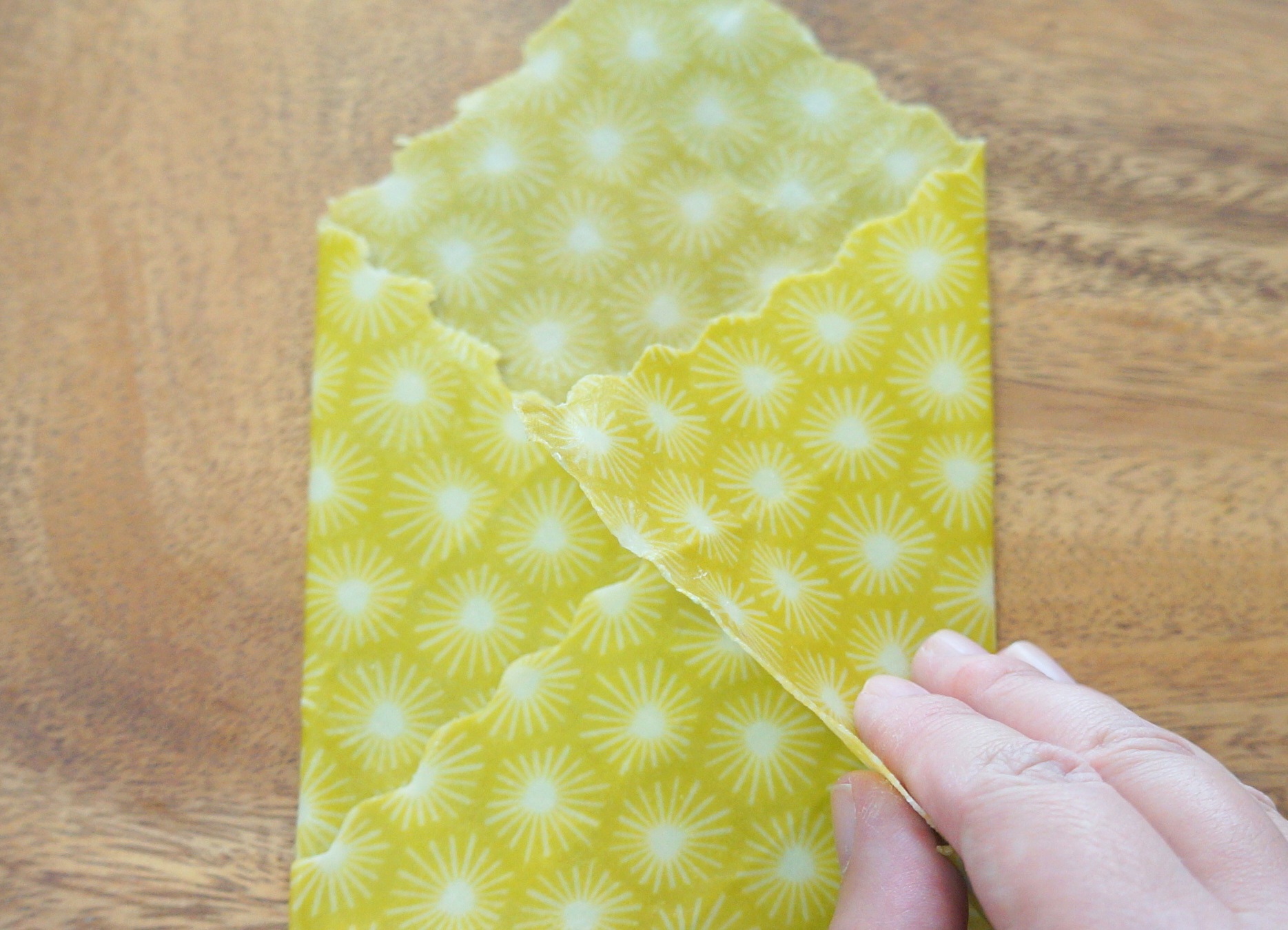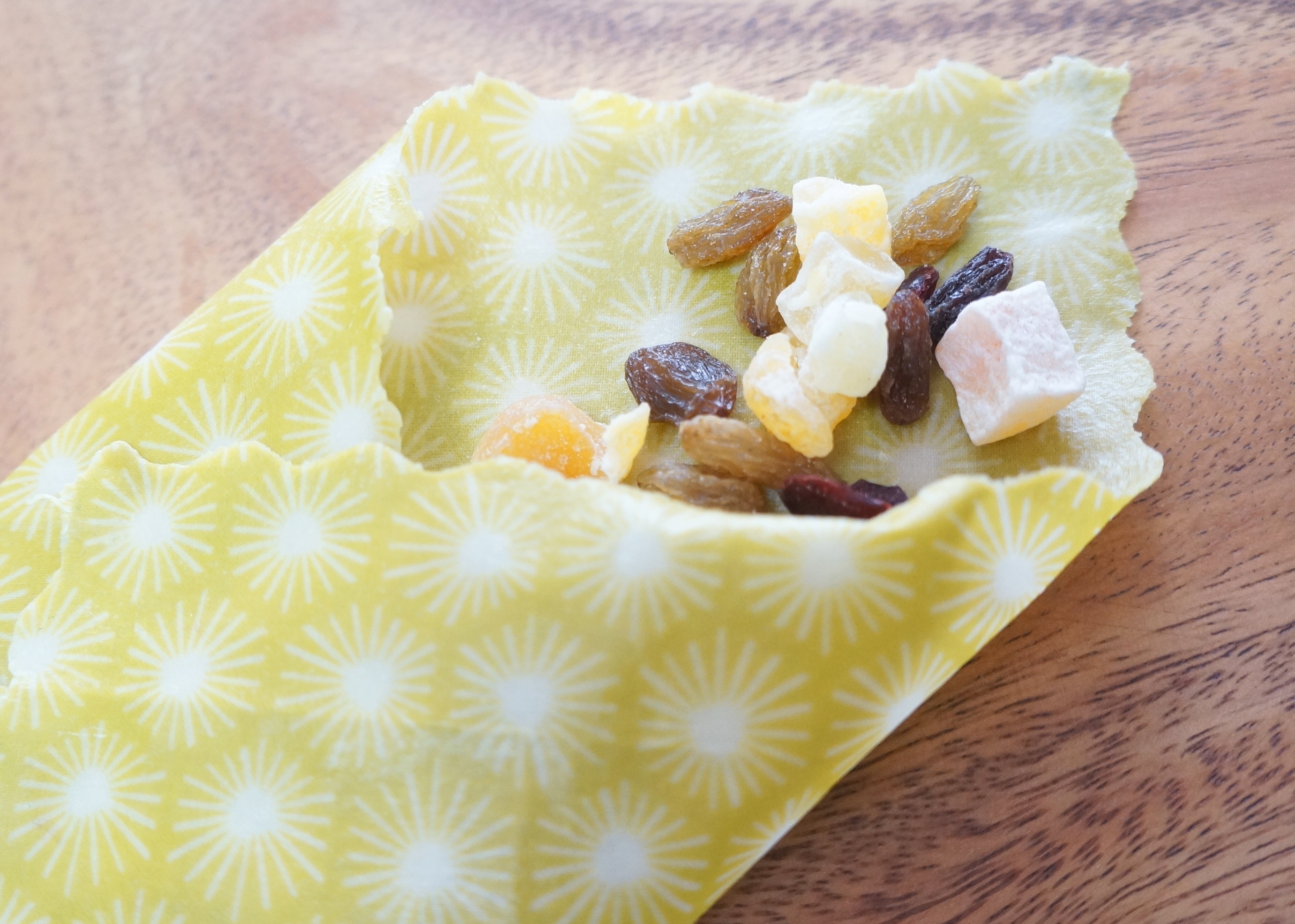 折り紙のように折りたたみ、ナッツやドライフルーツのように細かいものを一時的に保存するときも役立ちます。「Bee Eco Wrap」を折っていくと、接地面がペタッペタッとくっつくので、簡易的なケースができあがります。