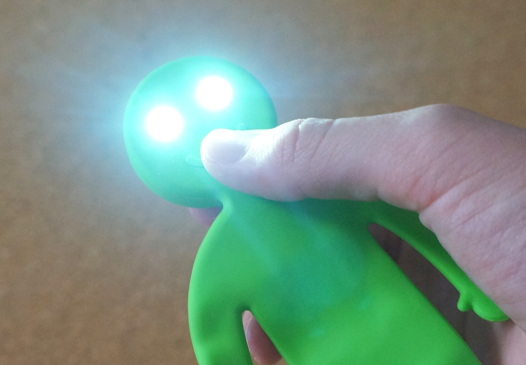 「ライトマン」は、レイメイ藤井が販売する人型のブックライト。口の部分を押すとLEDライトが作動し、目からLEDライトが光ります。