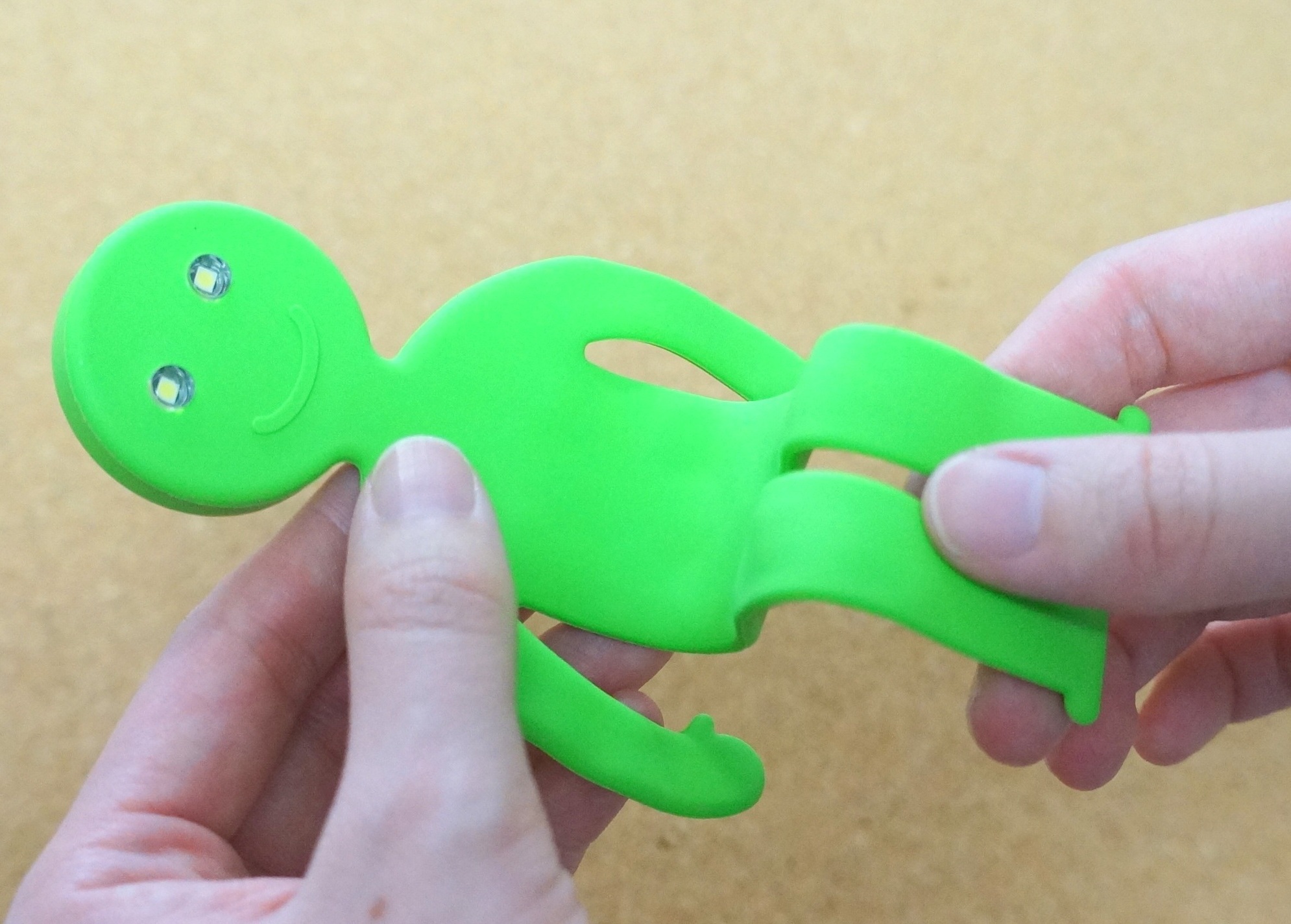 ここまでライトとしての使い方を説明してきましたが、ユニークな表情、自在に折り曲げられる手足といった「ライトマン」の特性を、ほかの用途に使わない手はありません。たとえば、「ライトマン」を体育座りのような姿勢に折り曲げると、スマホスタンドとして利用できます。