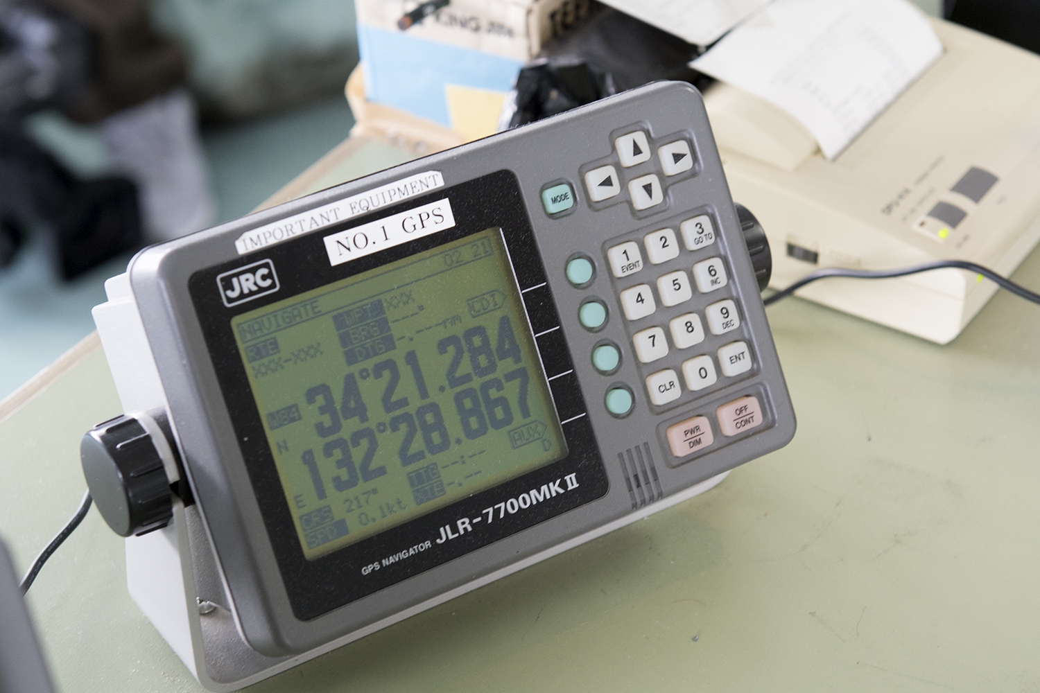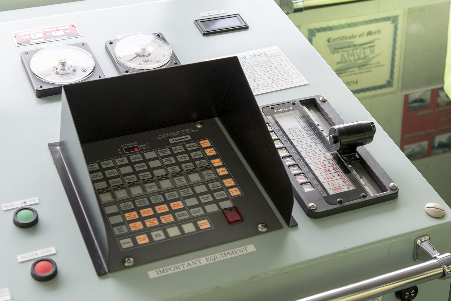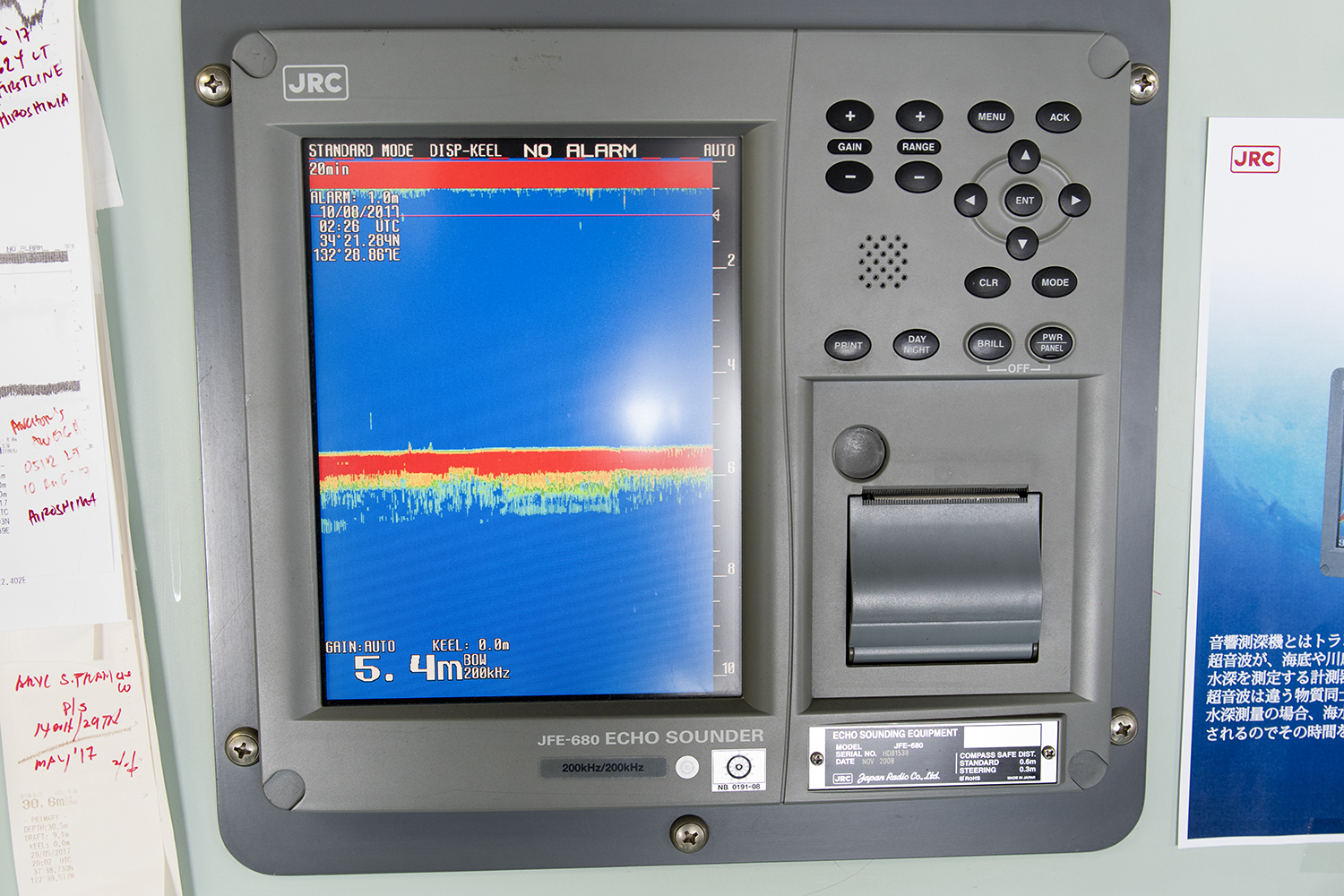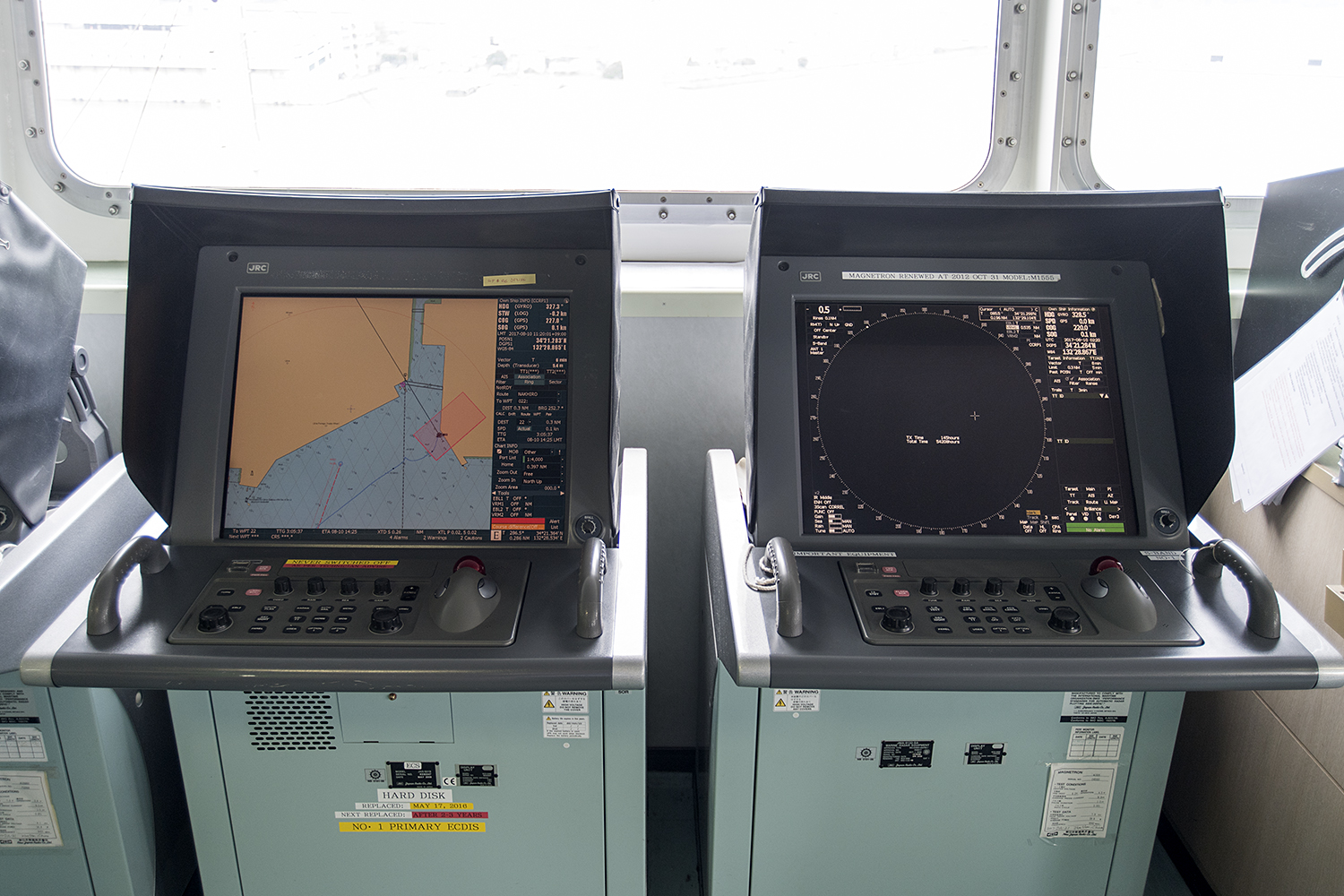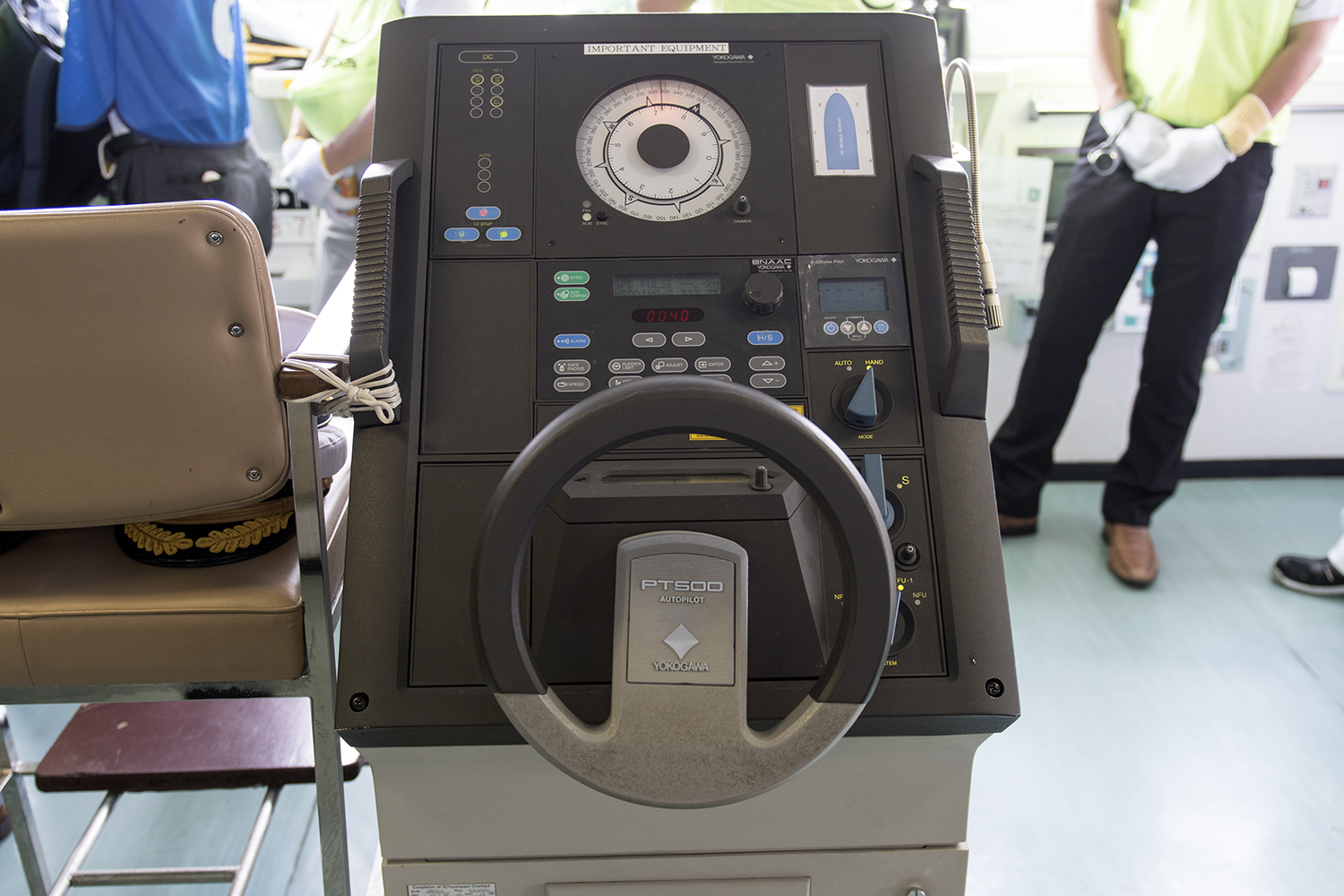 その後、乗組員の居住区をとおり、この巨大貨物船の操船を司る操舵室にもお邪魔しました。現代の貨物船ですから、チャートテーブルの上にはコンパスや分度器、海図が…ということはなく、操舵室にはアナログの計器類のほか、超音波により水深を計測する音響測深機、GPS、レーダーなど、デジタル表示の計器やカラーのディスプレイがズラリと並んでいます。例えば“ECDIS(電子海図表示システム)”には、自船の位置だけでなく、航路上の危険海域といった情報も鮮明に表示されており、その様子はまるで、SF映画のようでした。