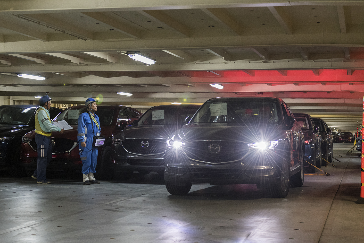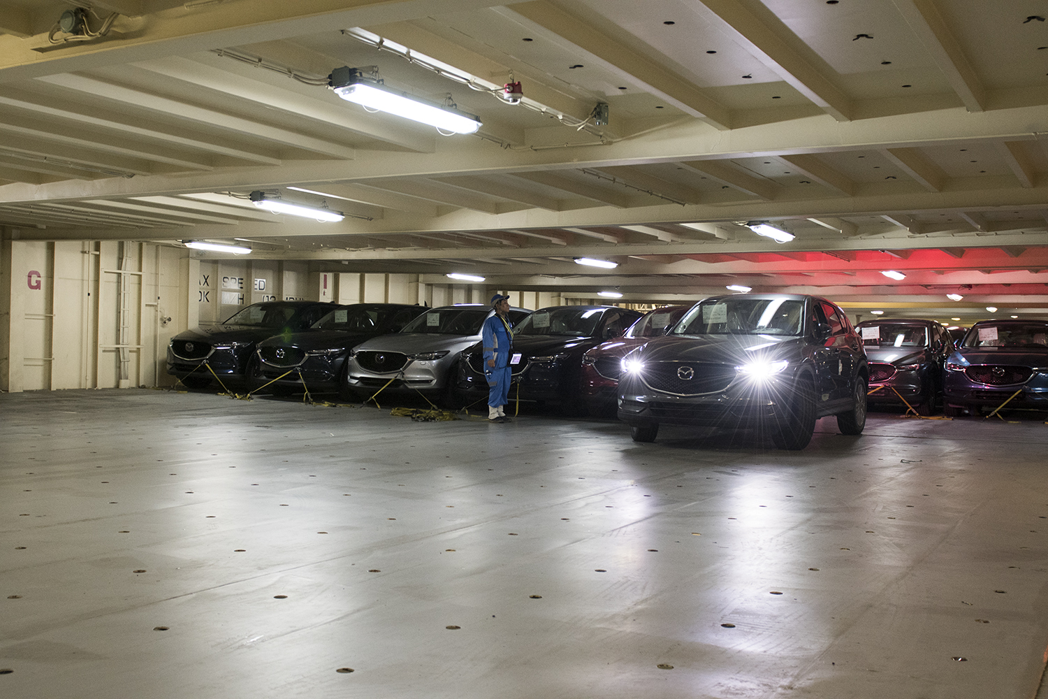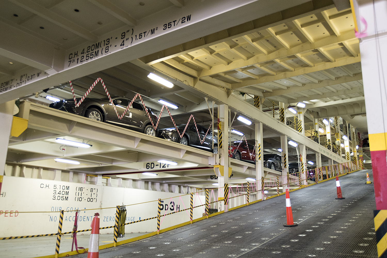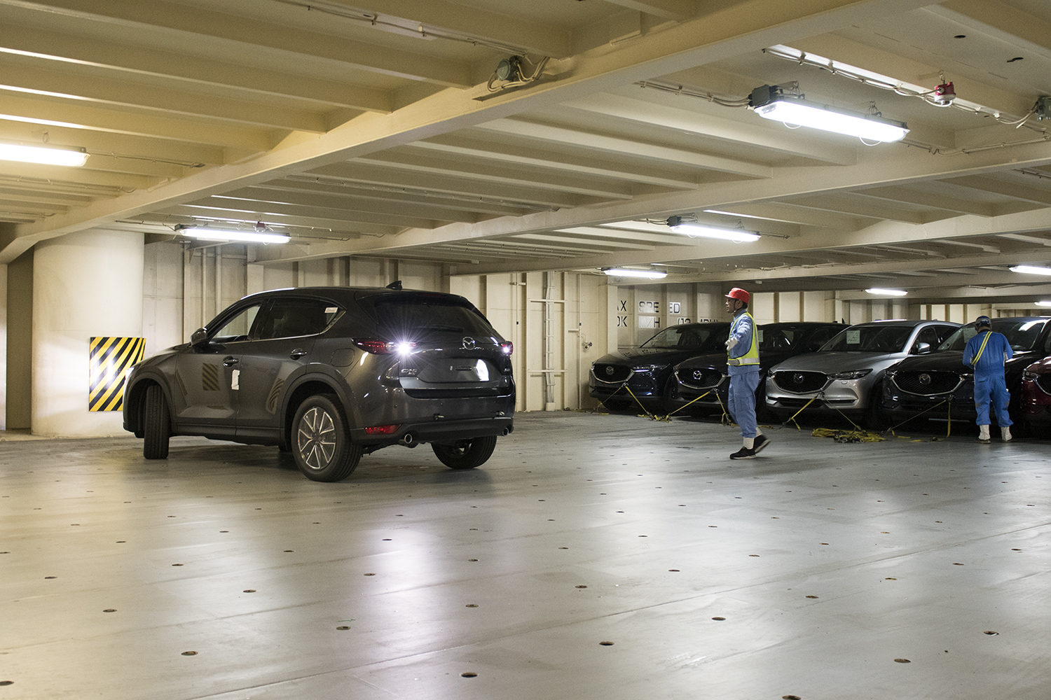 ブラジリアハイウェイは12層の車両デッキを備えていますが、各デッキはさらに細かく区画が分かれており、車両は積み込みプランに沿って指定の区画に収められていきます。ちなみに車両同士は、前後30cm、左右10cmというわずかな間隔で積み込まれるのですが、ドライバーは仲間の指示に従って、寸分のズレもなく決められた位置に駐車していきます。