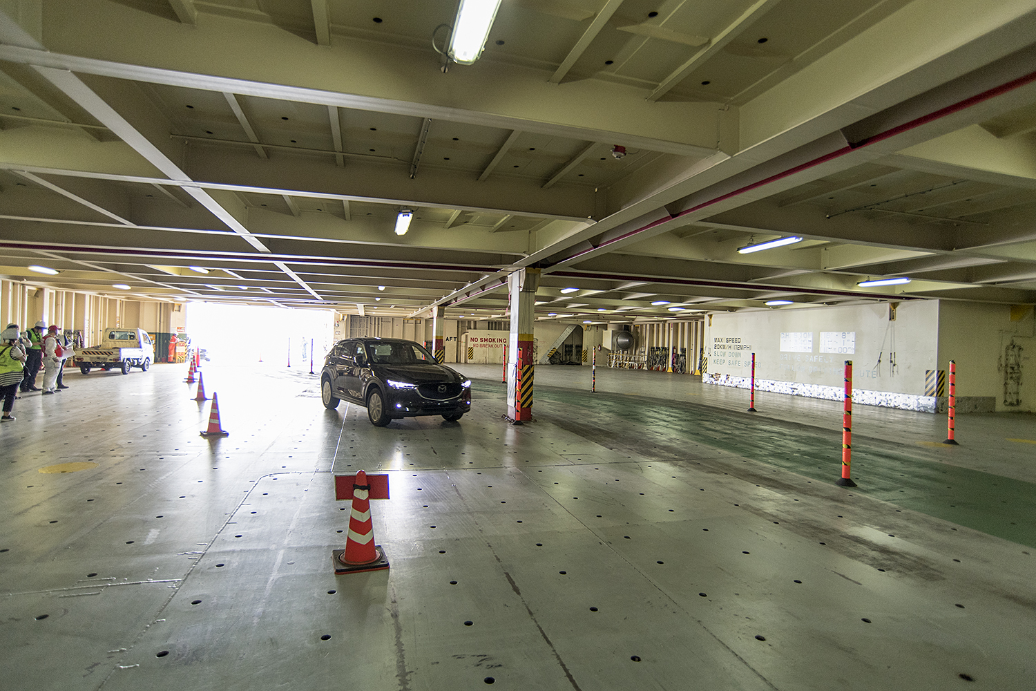 ひとり当たり10台ほどを約8時間で、と思えば、「確かにできそうかも…」と感じられるかもしれませんが、車両甲板での積み込み作業は、実に緻密な車両コントロールが要求される、まさにプロの仕事なのです。