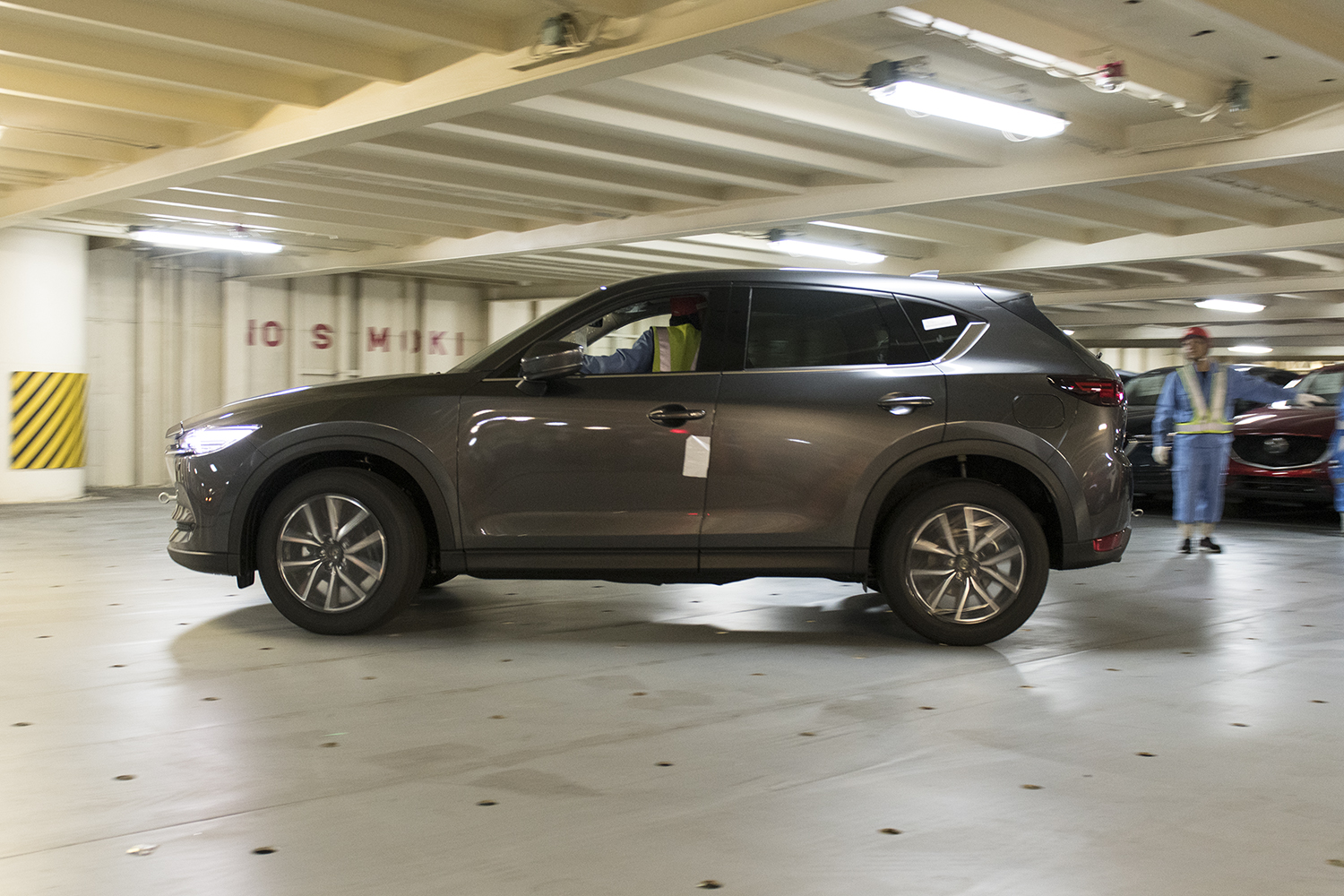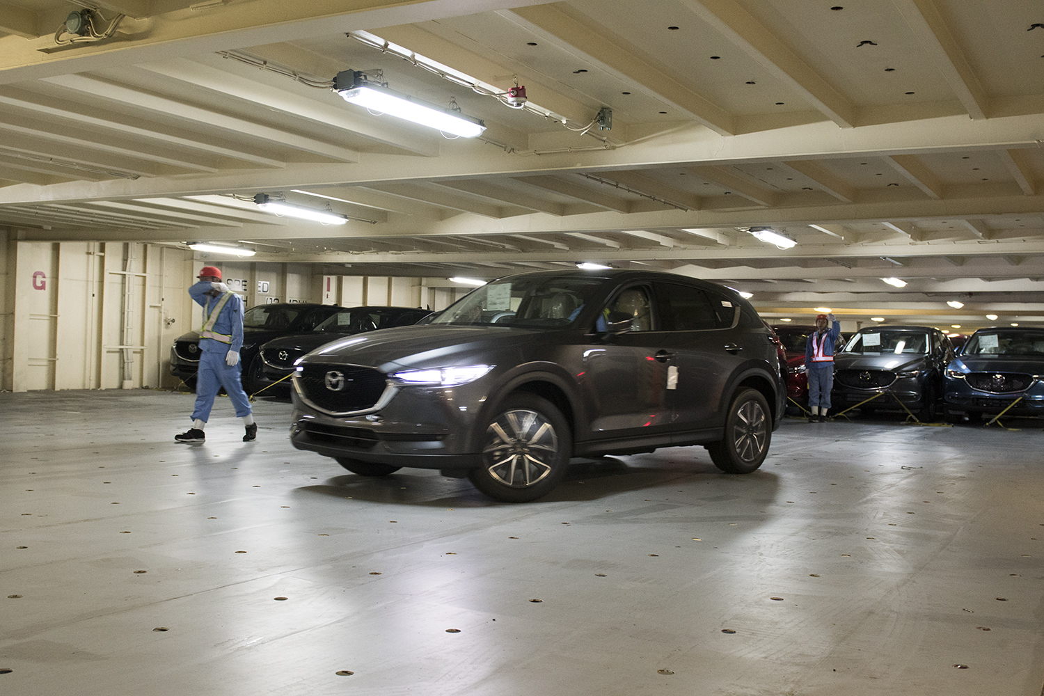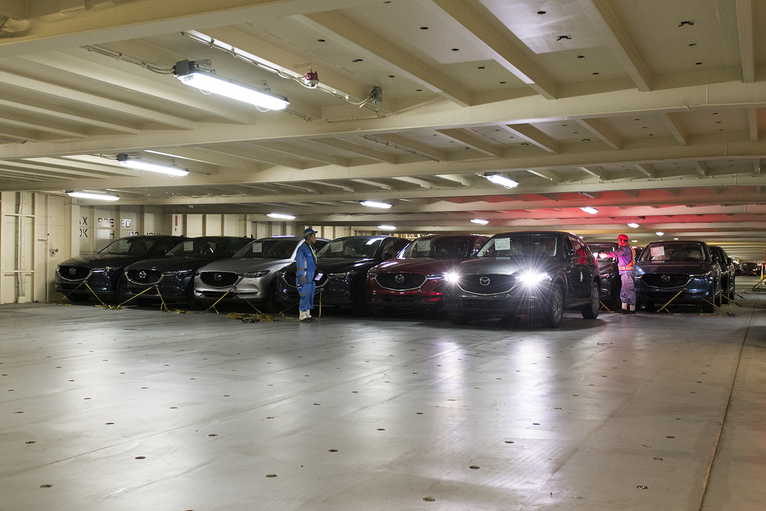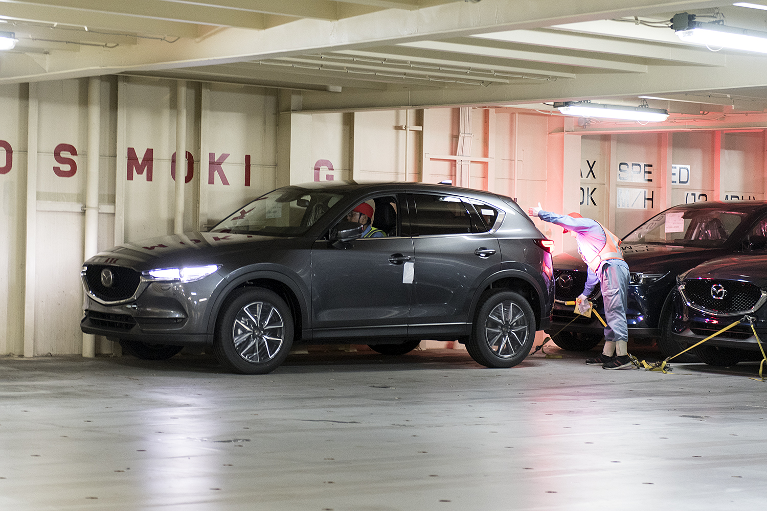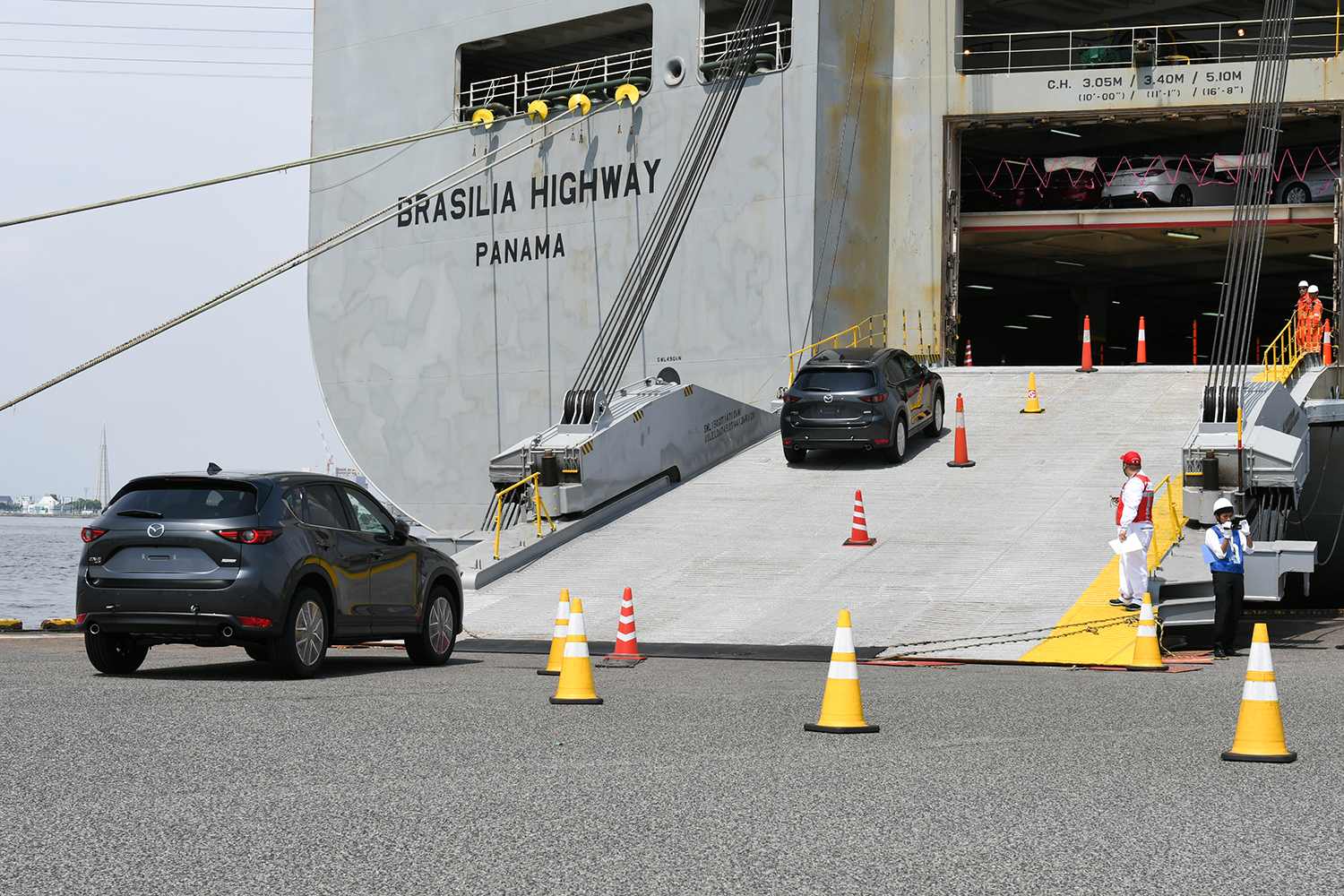 見学会では、広島にあるマツダの宇品工場にある岸壁で、川崎汽船の自動車運搬船「ブラジリアハイウェイ(BRASILIA HIGHWAY)」への積み込み作業が公開されました。“K”LINEのロゴマークでお馴染みの川崎汽船は、2017年3月現在、コンテナ船のほか原油やLNG、LPG向けのタンカーなど、560隻を運航する総合海運会社。また同社は、日本における自動車専用船のパイオニアでもあり、実に93隻もの自動車運搬船を運航しているそうです。