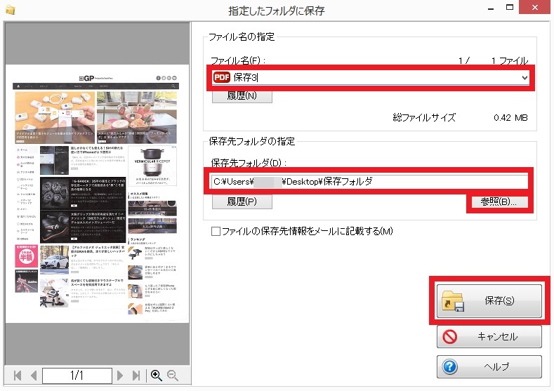 ▲ファイル名を入力し、「参照」から保存先を選ぶ。最後に「保存」をクリック