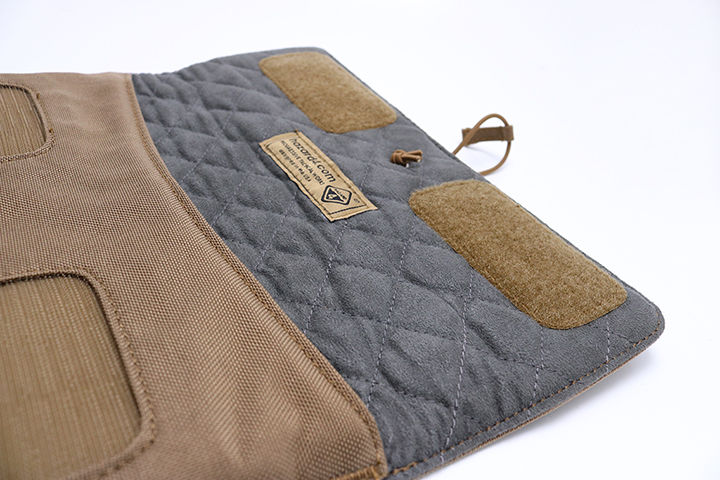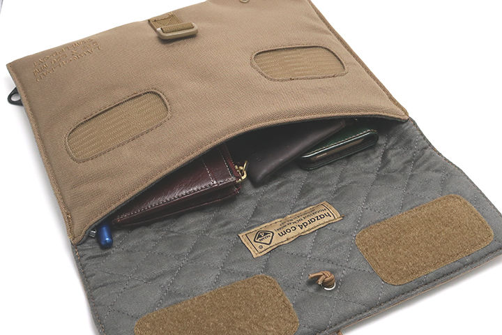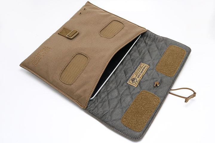 フタは留め具だけでなく、それなりに広い面積のベルクロでも留められています。開くたびにバリバリと音がします。これもミリタリー系のお約束…ではありますが、もうちょっとどうにかならないものでしょうか。反面、内装はキルティング入りの特殊な素材で質感は良好。厚みもあり、十分にiPadなどタブレット端末を保護してくれるかと思います。この素材はなかなかの肌触りの良さ。身近なものではマイクロスエードに似ていますが、正式な素材名はわかりません。