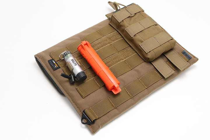 外装背面にモールウェビングを搭載。かなりの面積があり、厚みのあるポーチを複数つけたら、どっちが本体かわからなくなりそうなサイズ感です。ここではカリマーSFのマガジンポーチ、GLO-TOOB AAA + H2T ホルダー、THYRM CELLVAULTを合わせてみました。こうして自分好みに組み替えられるのはメリットですね。