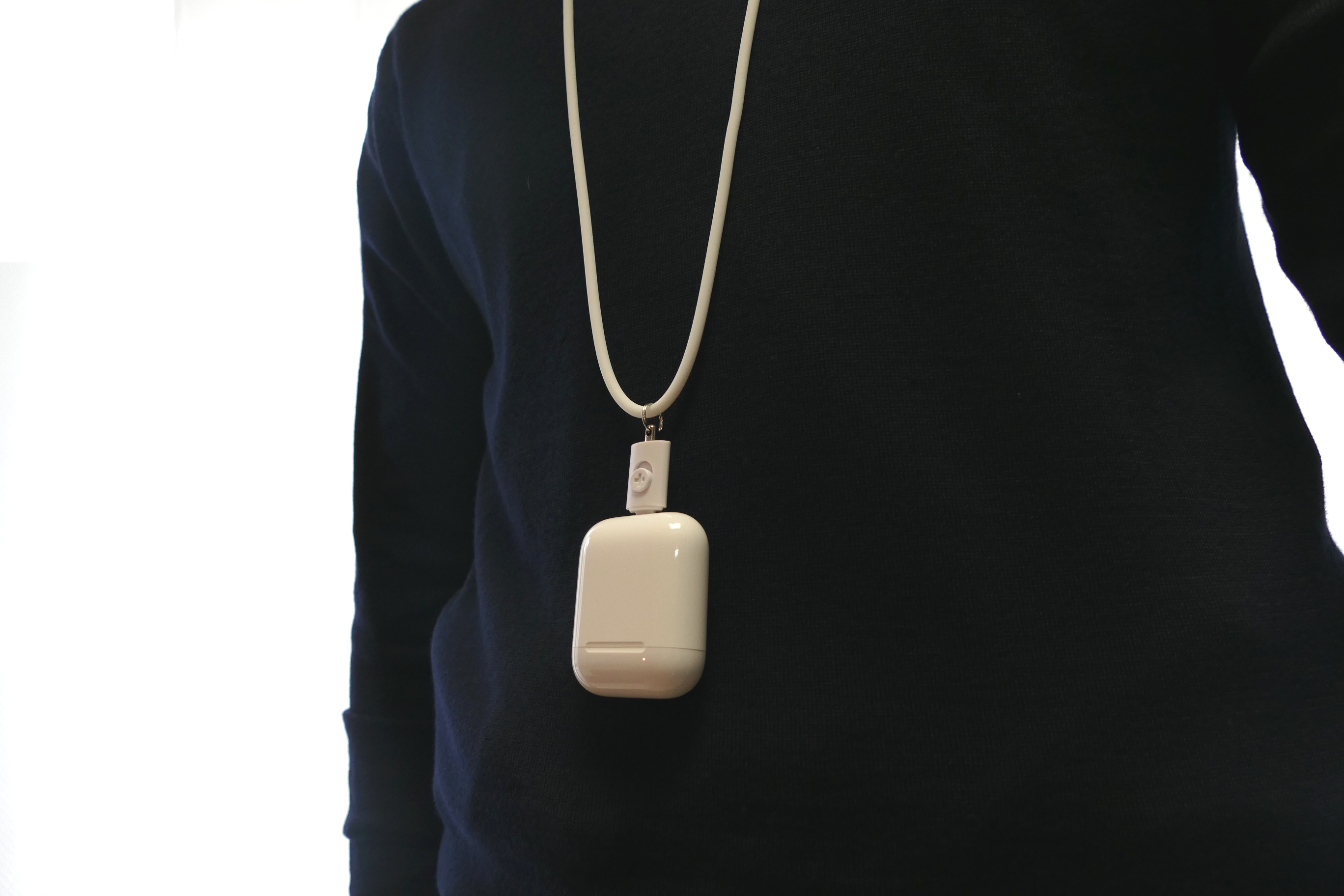 さて、筆者がイメージしていた使い方はこちら。Apple純正のフルワイヤレスイヤホン「AirPods」を持っている場合には、そのストラップとして使えるのではないかと……。