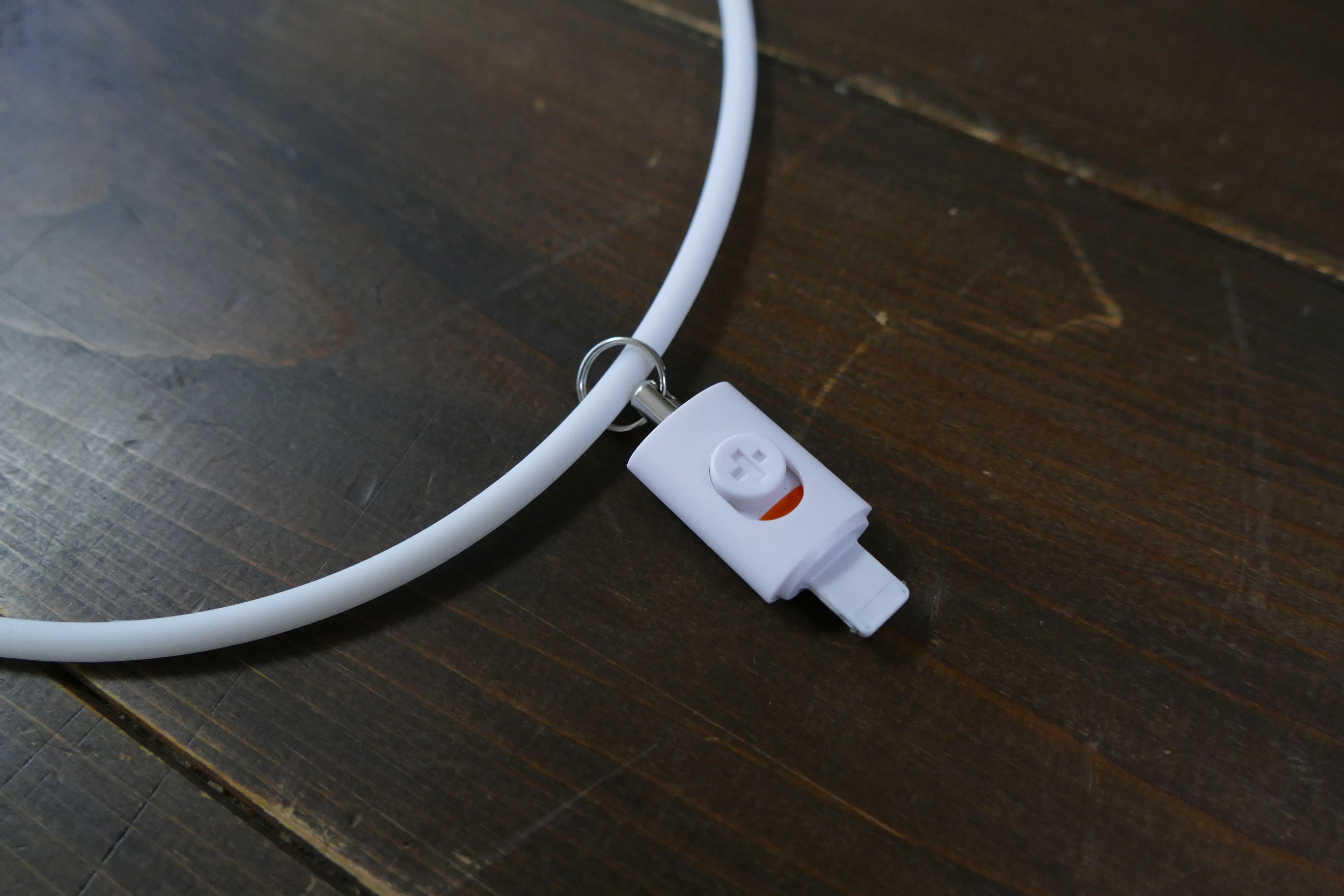 カラーは10色展開。今回は白を選択しました。ケーブルはシリコン製で、埃がつきにくいようなコーティングも施されています。少しの期間放置しておいても、汚れはそれほど目立ちません。アジャスター式になっているので、長さの調整はある程度自由に行えます。