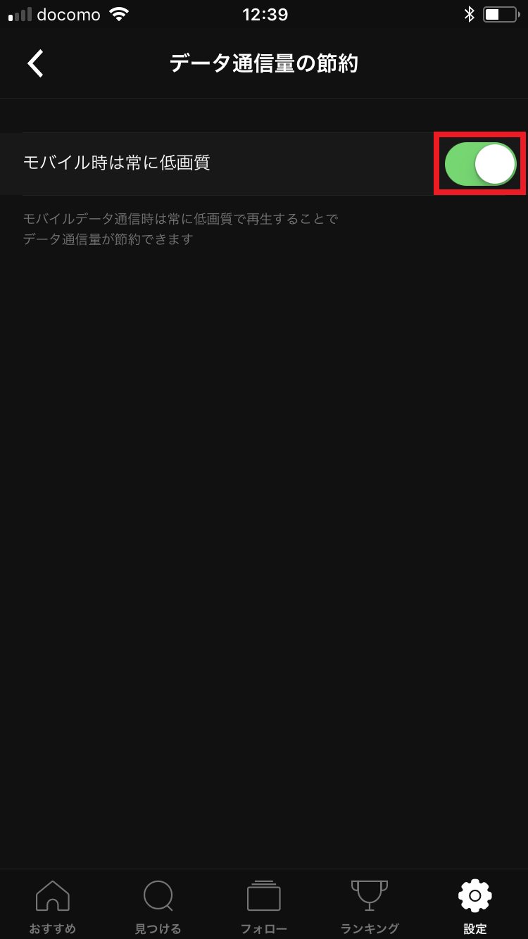 画面右下にある「設定」をタップして、そして「データ通信量の節約」をタップ。次に、「モバイル時は常に低画質」のスイッチをオンにするだけで設定完了です。通勤電車や会社での休み時間に長時間番組を楽しみたいときに活用できます。