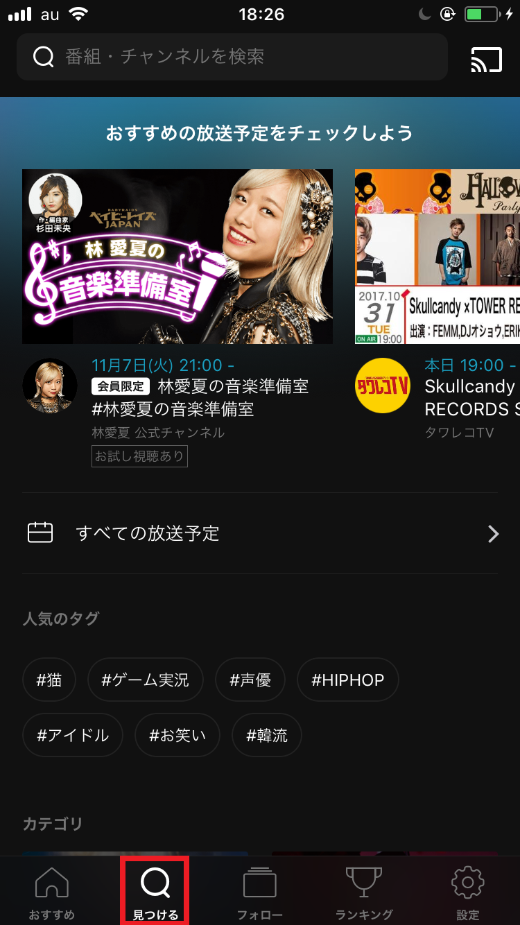 ▲「見つける」をタップして、「おすすめ」や「カテゴリ」から見たい番組を探そう