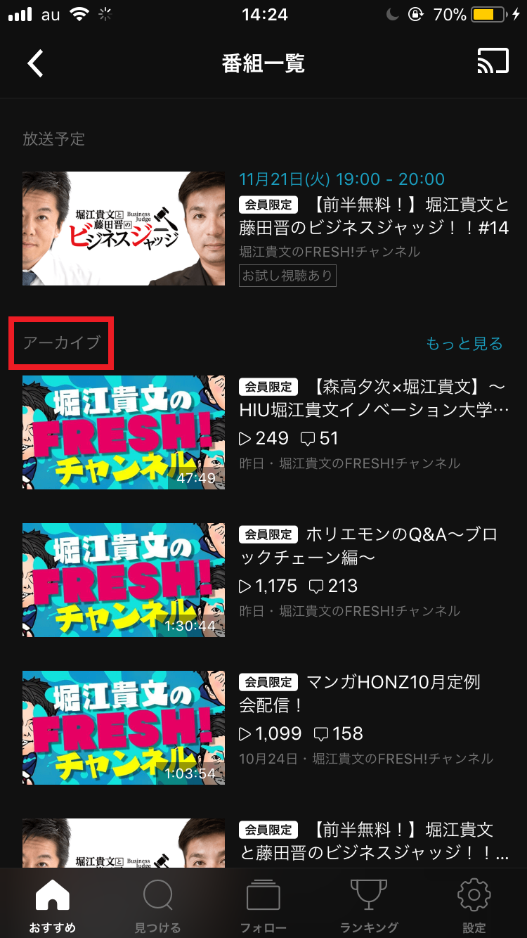 「FRESH!」では、放送が終了した番組の多くを「アーカイブ」から再生できます。配信元が公開をやめたり、番組そのものが「生放送限定」でない限り、放送後の視聴が可能なのです(ただし、一部の配信元はアーカイブを公開していない場合があります)。