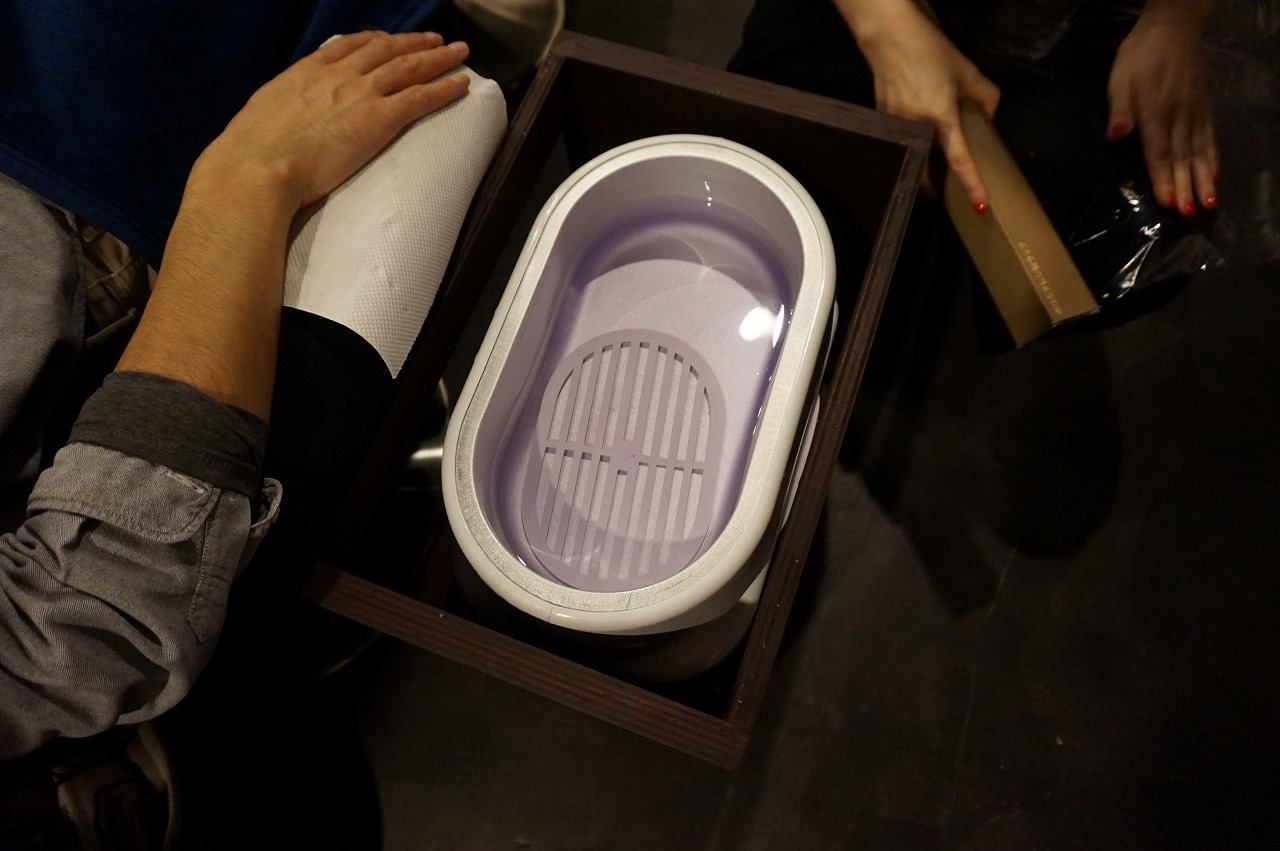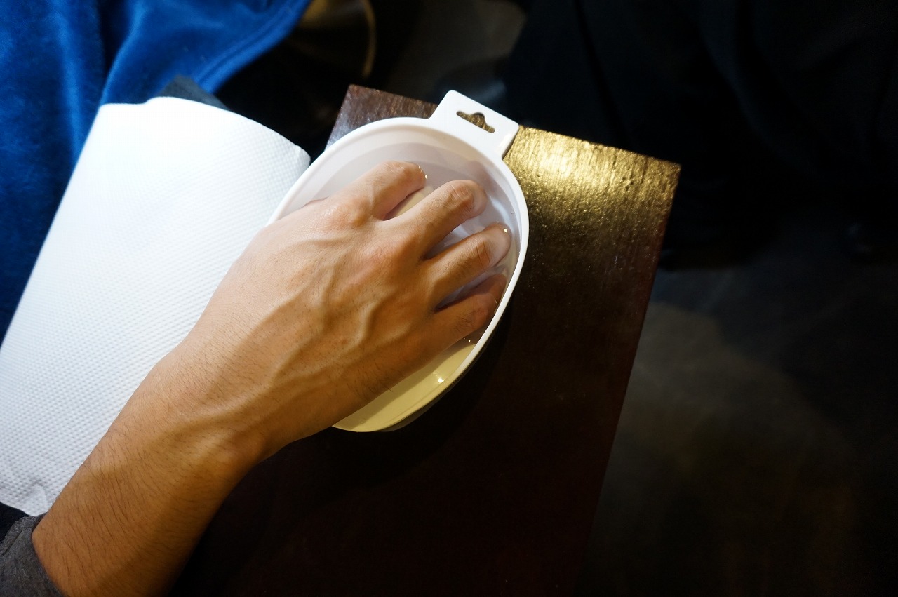 爪の周りの古い角質を落としやすくするため、手をお湯に入れ皮膚を柔らかくします。皮膚の固さにもよりますが、大体2、3分くらいが目安だそう。