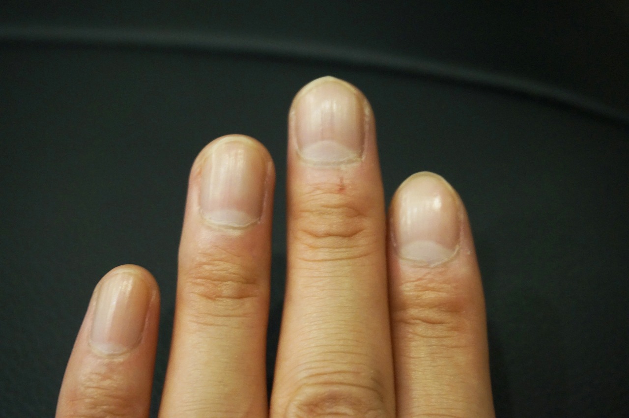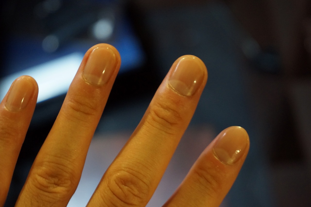 ▲右手が溶剤を塗っている状態。爪のツヤ感が全然違う
