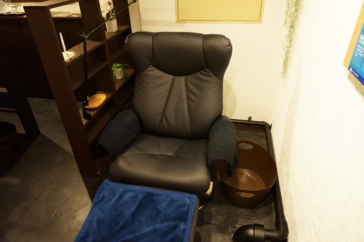 ほんのりアロマが香る店内は間接照明が多く、まるでオシャレなカフェのようです。女性向けのネイルサロンは店内が明るいことが多いのですが、「オトコネイル」は男性が落ち着けるよう照明を暗めに調整しているのだとか。しっとりとした革のリクライニングチェアで施術を受けます。