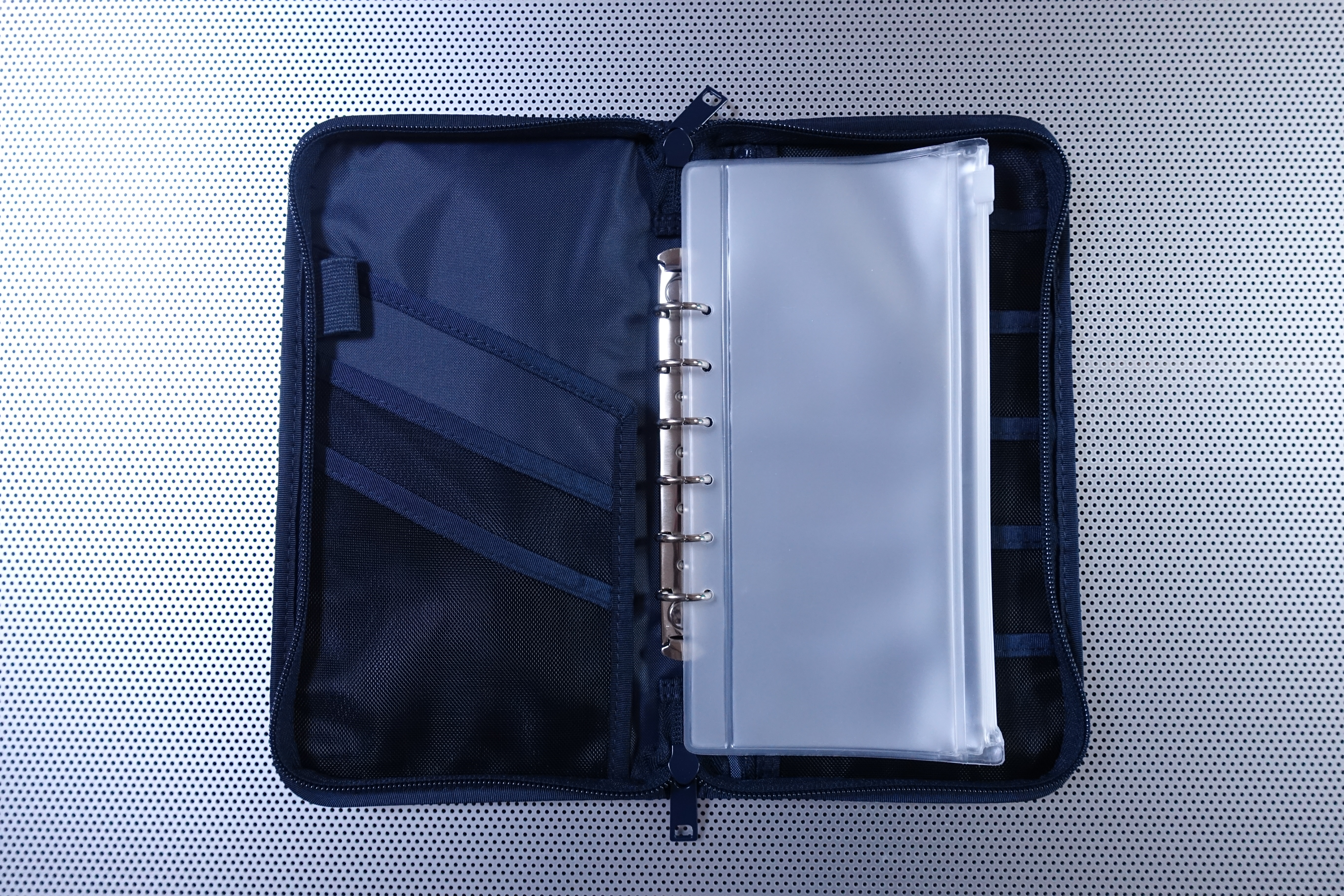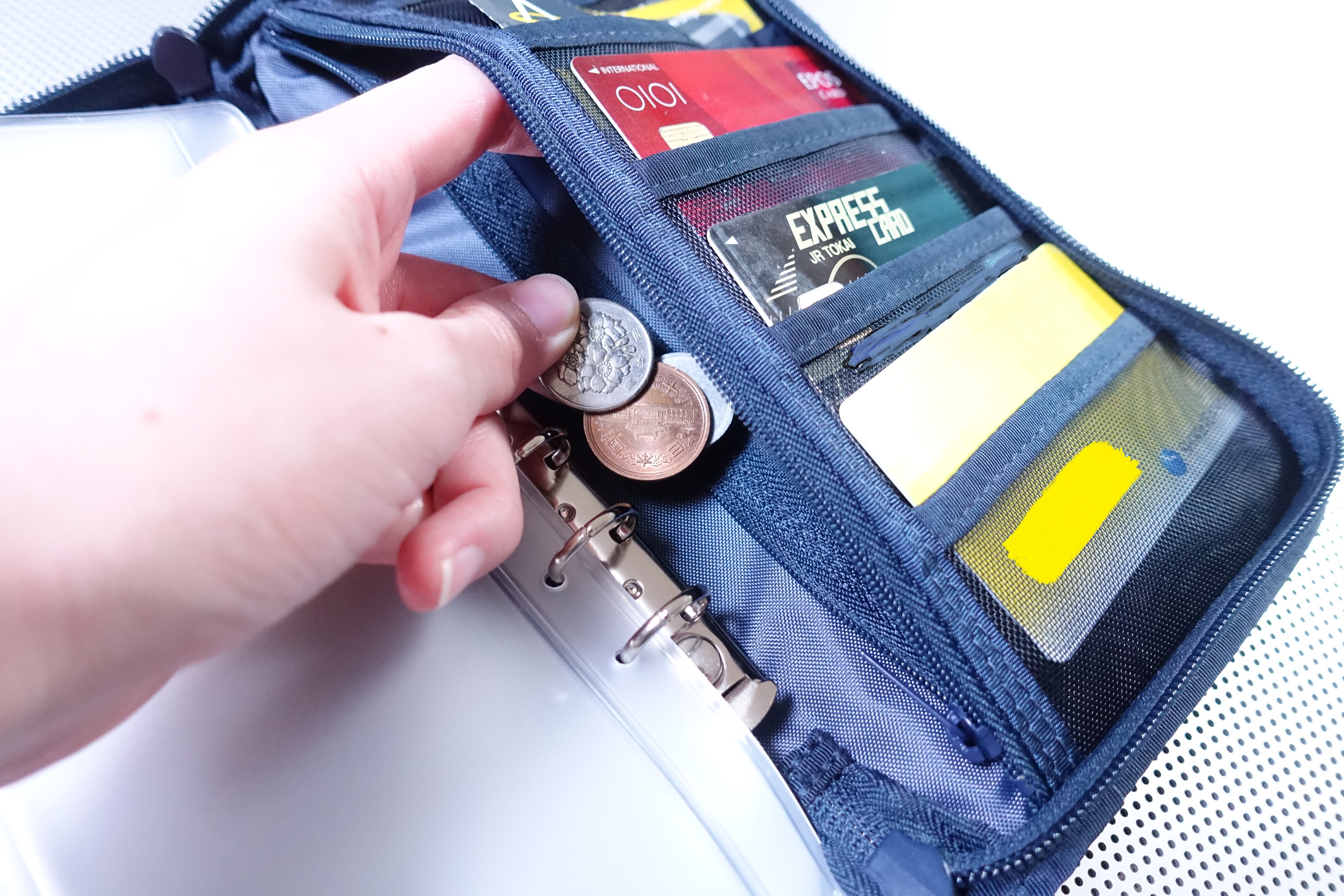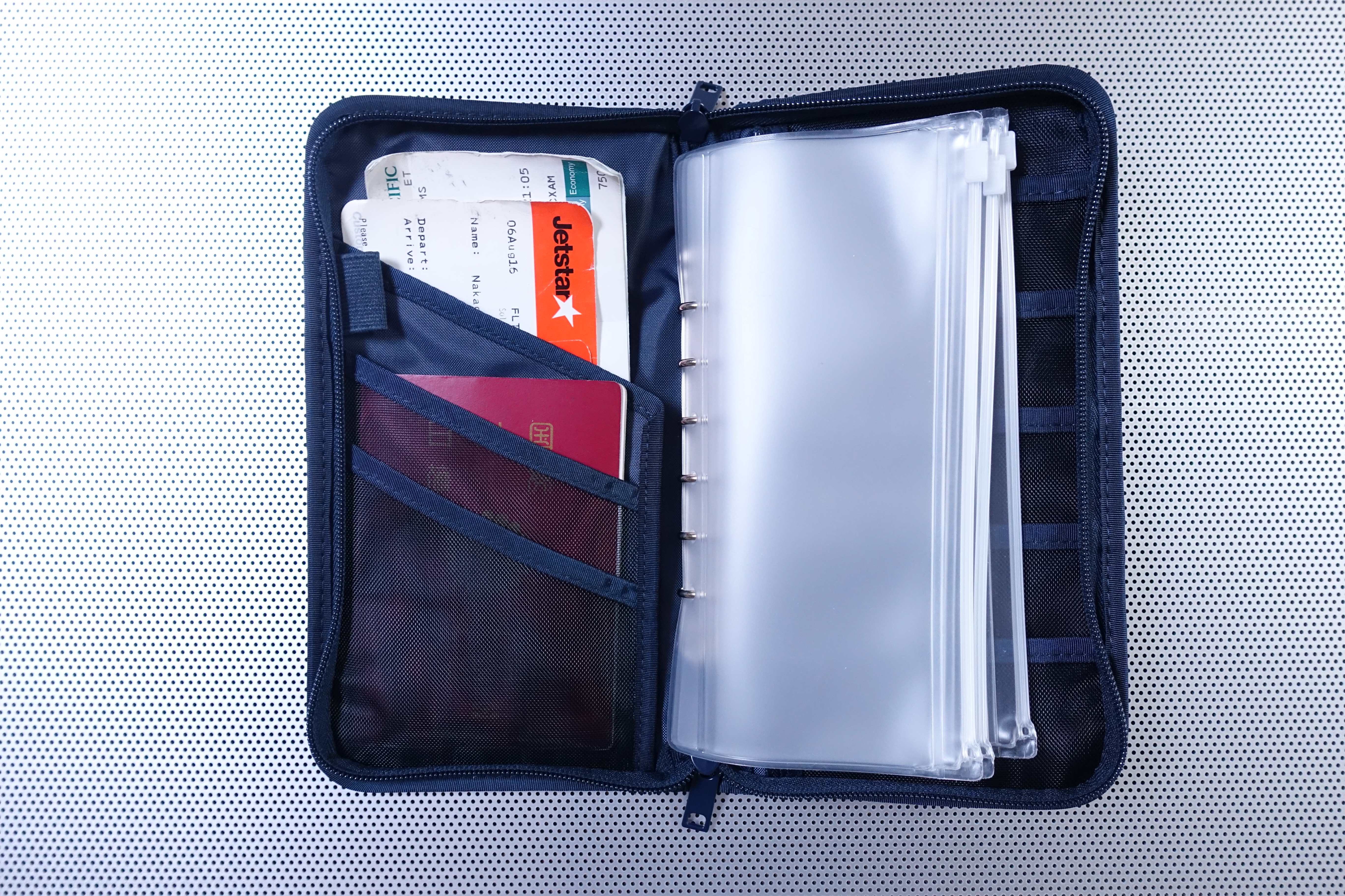 開くと真ん中がバインダーになっており、ファスナー付きの透明ポケットが3つ備わっています。航空券や現金、レシートや両替証明書など、細かい紙類をまとめるのに役立ちそうです。