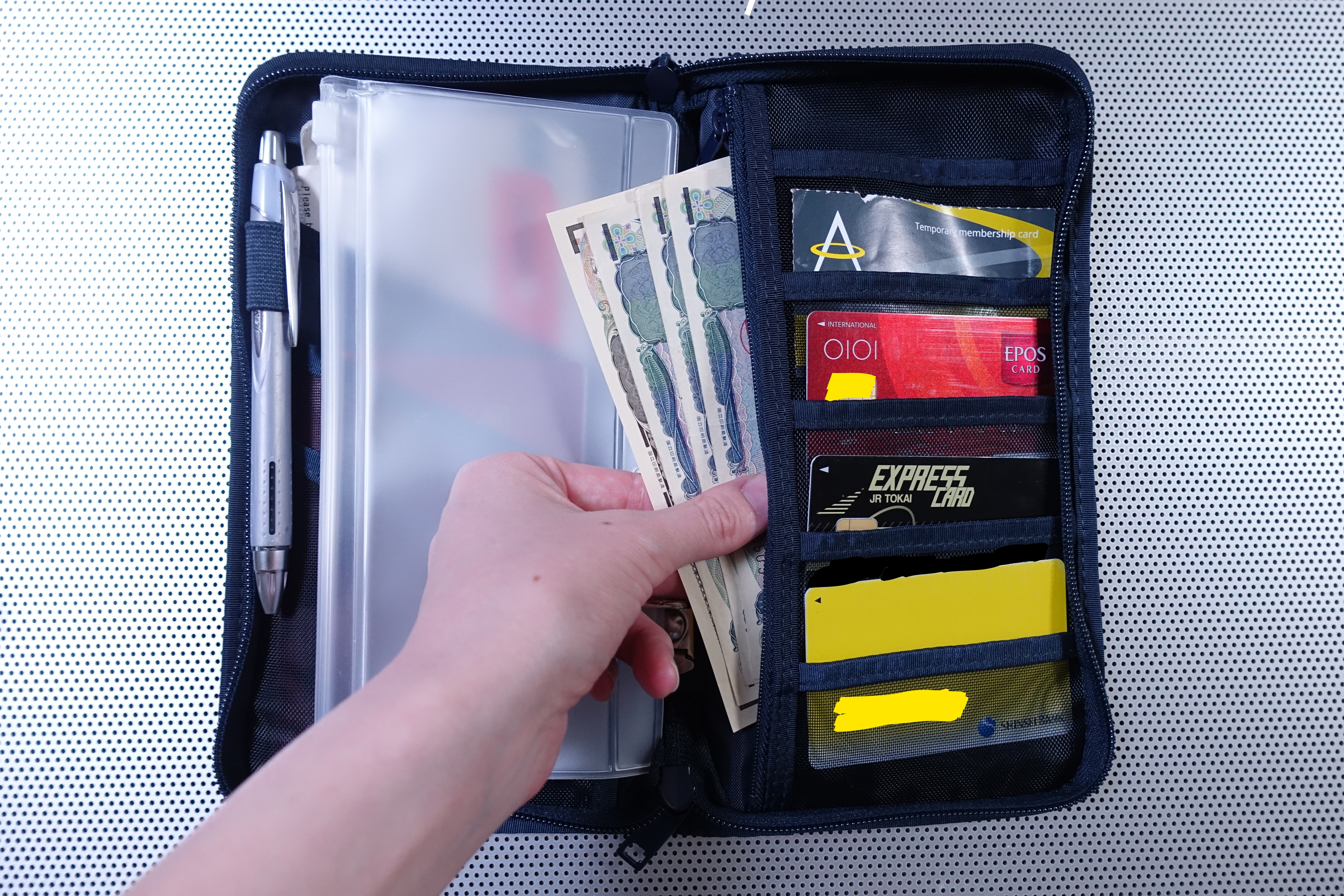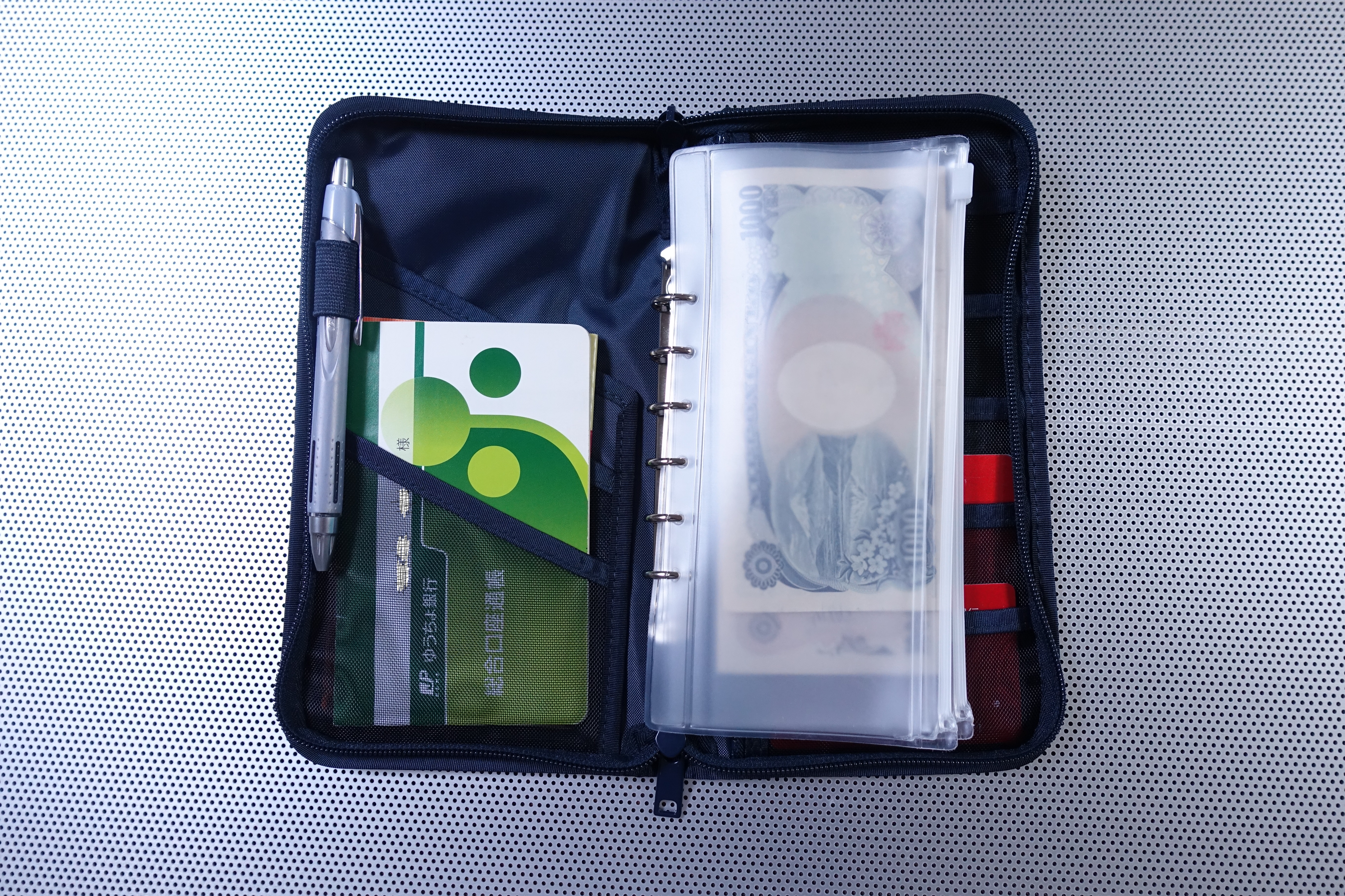 ではさっそく、旅行時に必要なものを収納してみましょう。入れたのは、パスポート、航空券、カード×3、ボールペン、日本円など。