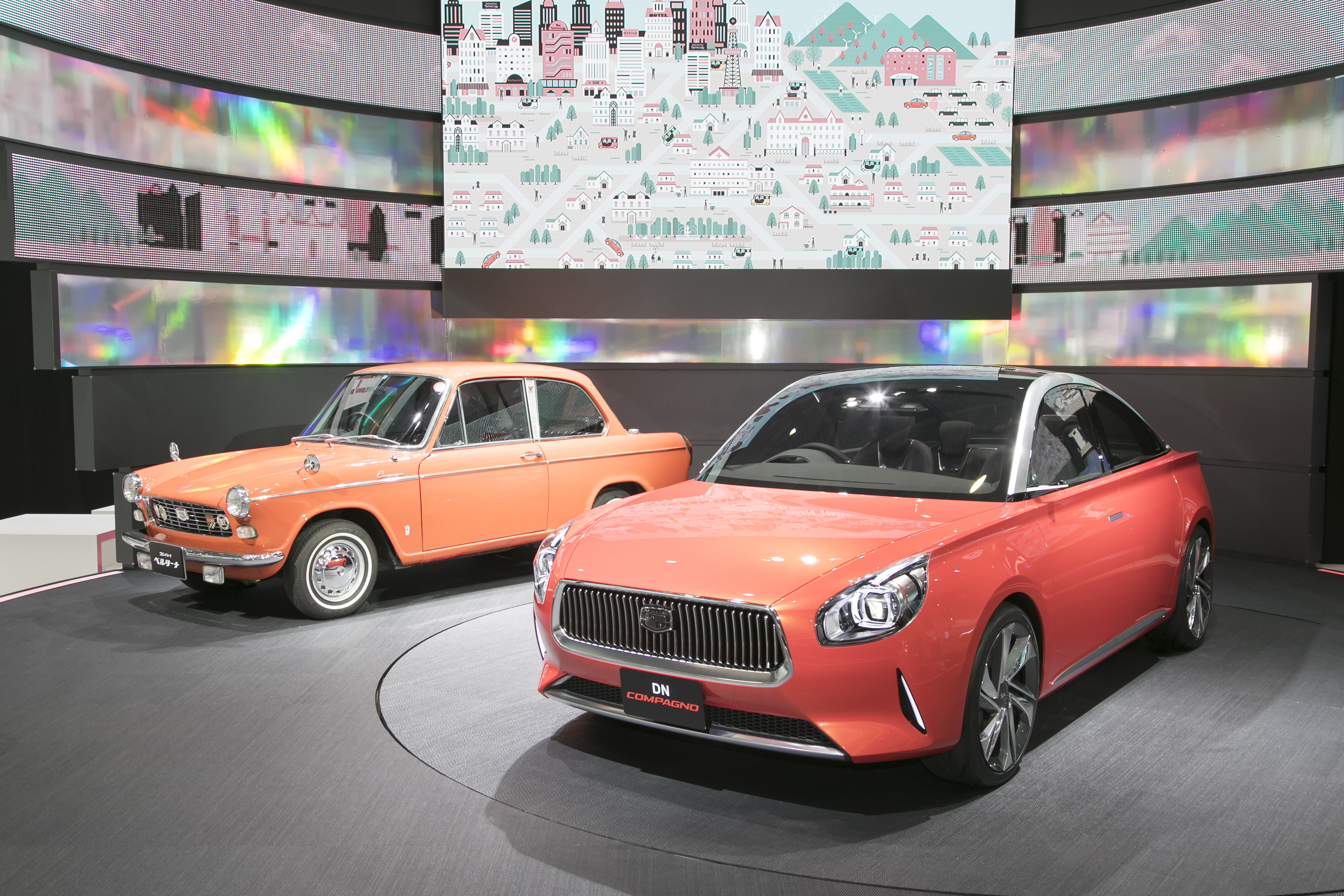 レトロといえば、ダイハツ「DN コンパーノ」のオレンジは、往年の名車「コンパーノ」のオマージュ。色に名前は付いていないものの、デザインとともに色もオマージュしたのだとか。