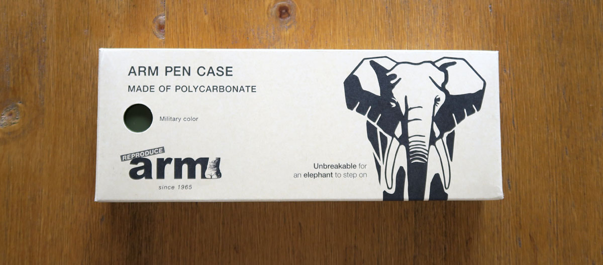手に取るとまぁ軽い軽い。よーく見てみると“ARM PEN CASE”って書かれています。えっこれもしかして、あの「アーム筆入」ですか? ♪像が踏んでも壊れない♪で有名なあの筆箱なんですか? たしかに<Unbreakable for an elephant to step on>って書かれていますよ。えぇそのままですね…。