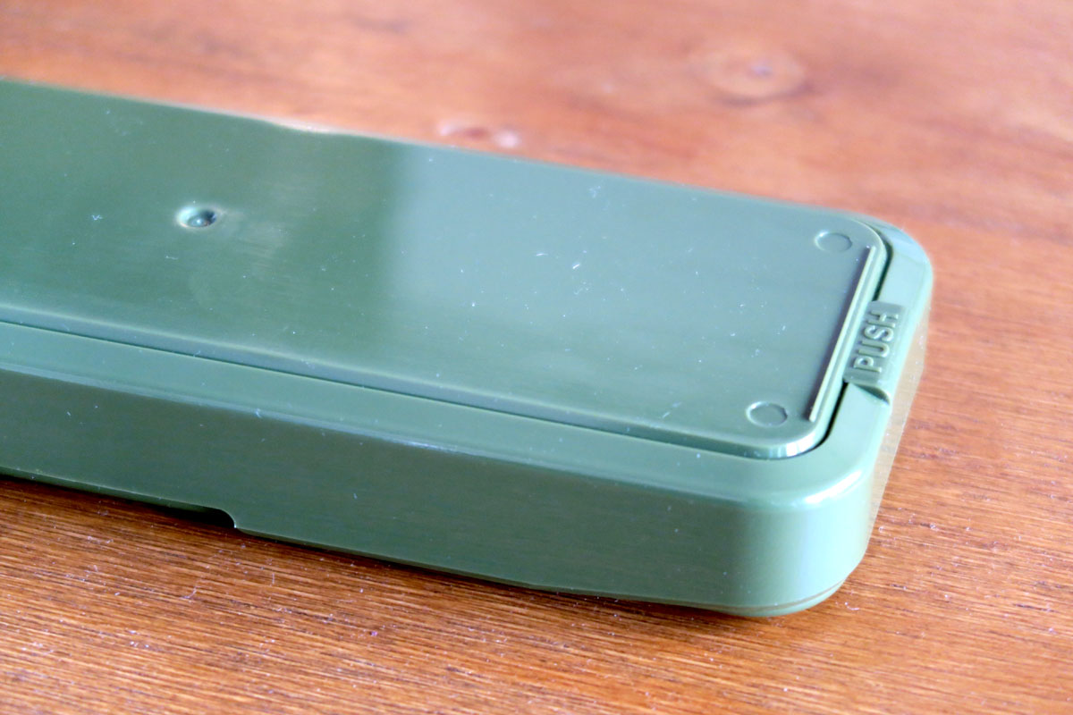 そんな時、フタの両端に<PUSH>の文字を発見。さっそく押してみると、逆側が持ち上がりました。おぉテコの原理! やるじゃん「アーム筆入れ」!
