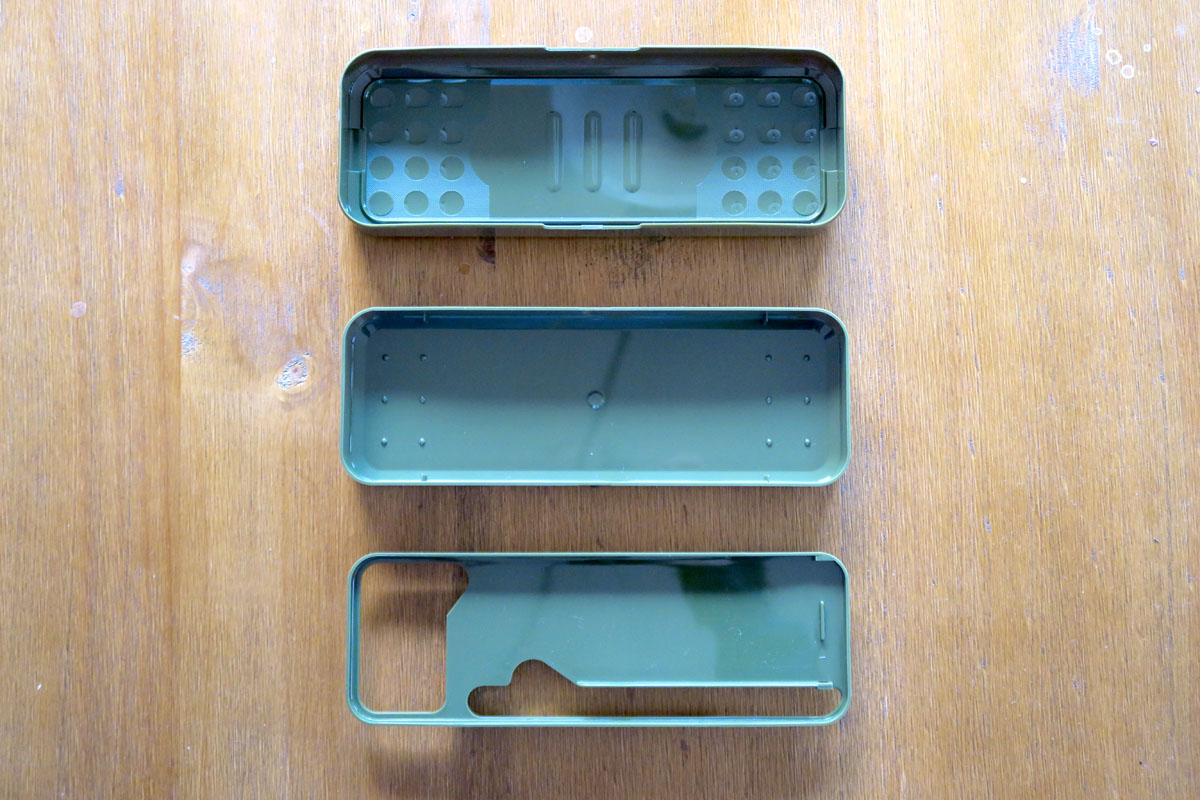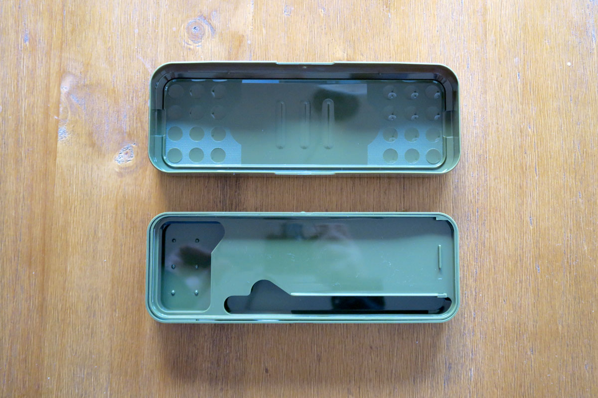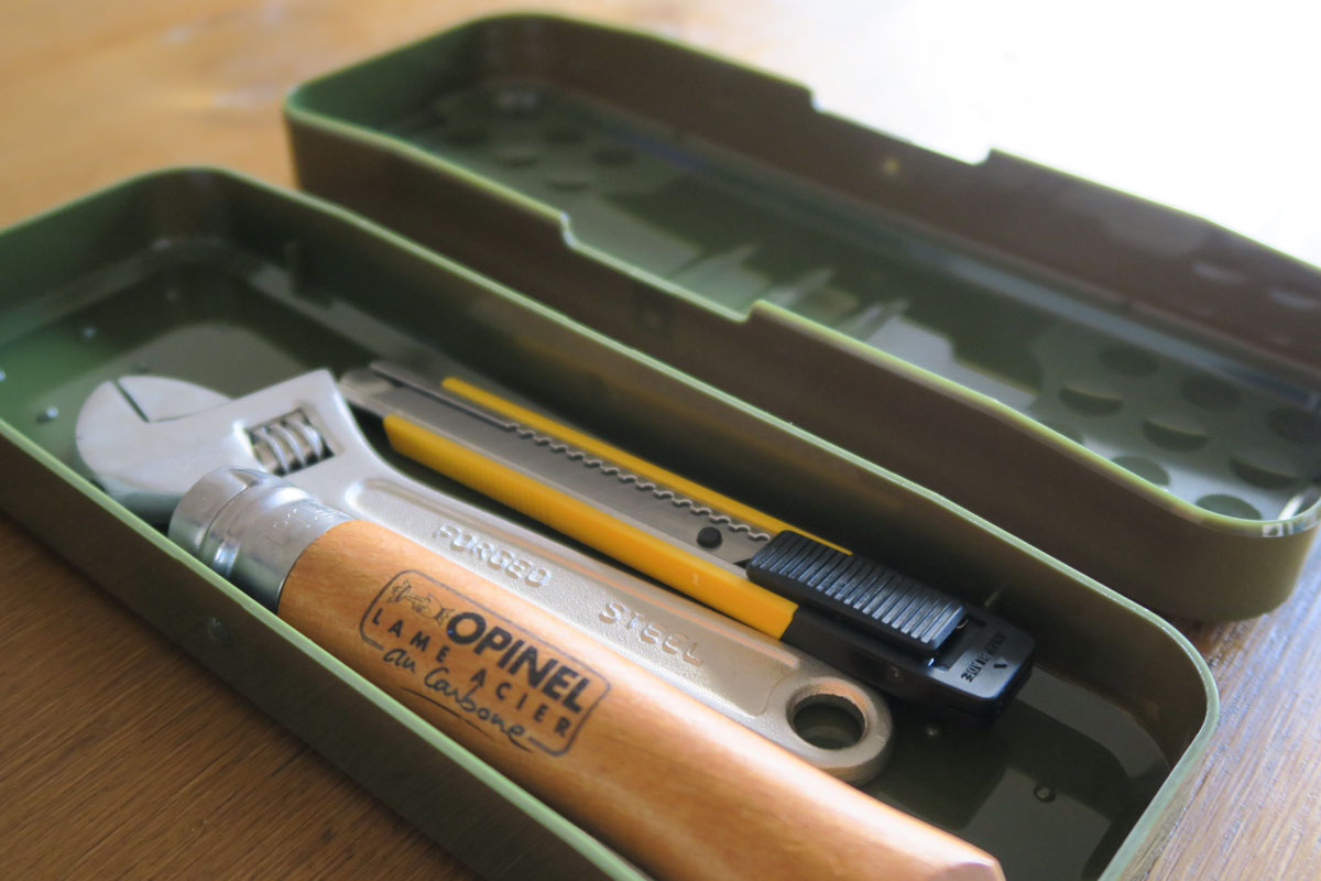 おぉ、ちょっといいんじゃないの? ミリタリーなカーキ色に道具類はピッタリです。他にも小型ドライバーなど、小学生が入れて学校に持っていったら先生に叱られて取り上げられそうなあれやこれやも似合いそう。
