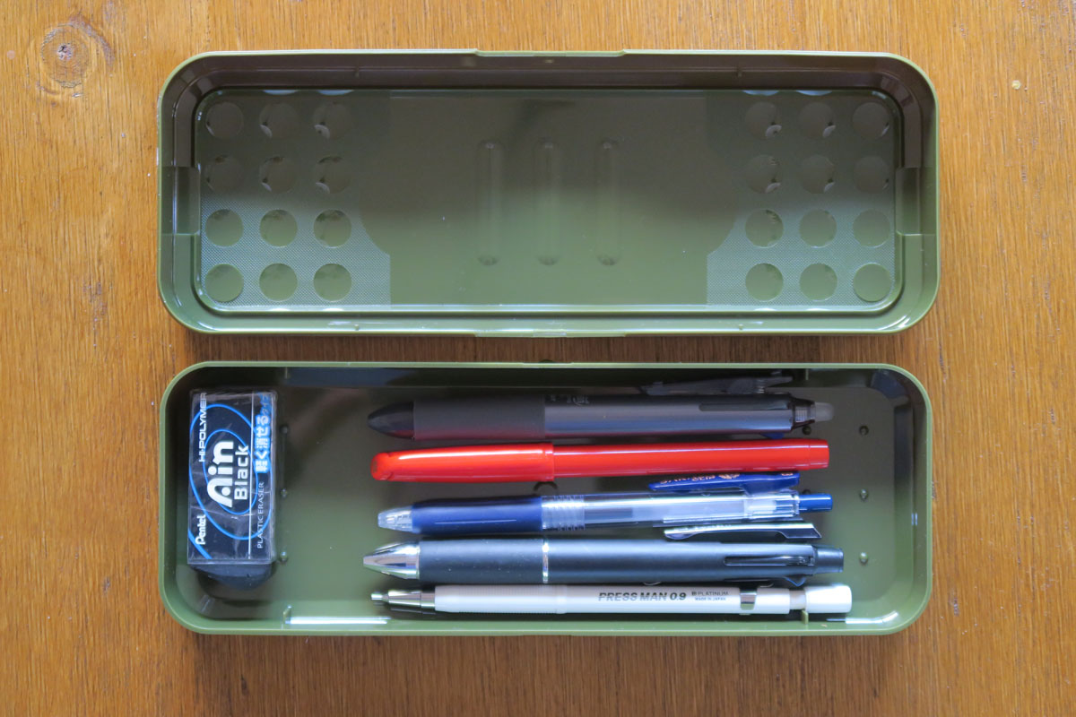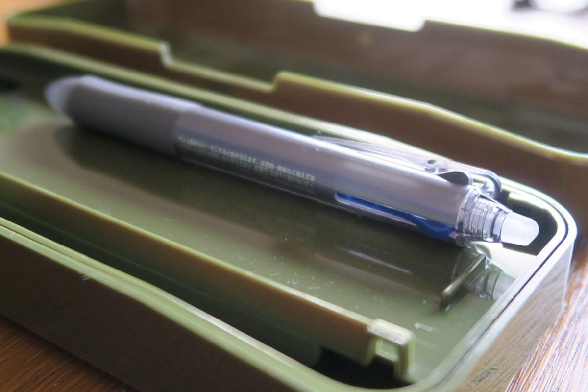 さっそく愛用のフリクション4を入れてみました。間違っても消せるのにボールペンなフリクションは、おっちょこちょいな自分にはピッタリなんです。だから常にペンケースには入っています。