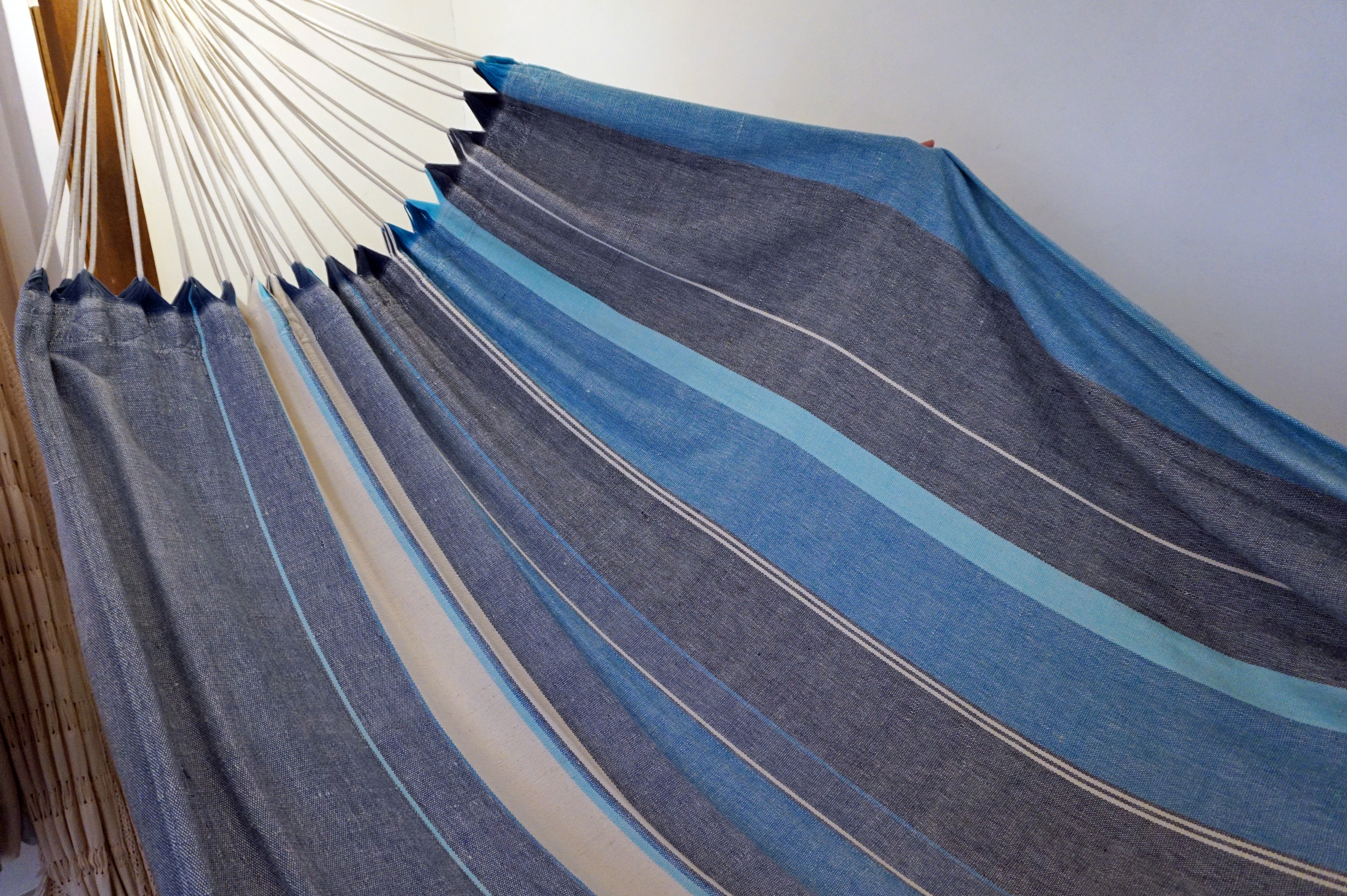 まずは、布地のハンモック。ブラジリアンハンモックは、ボディ部分が一枚布でできているのが特徴。厚手の手織りなので耐久性にも優れ、包み込まれるような安心感があります。乗った時に安定感もあるので初心者向け。