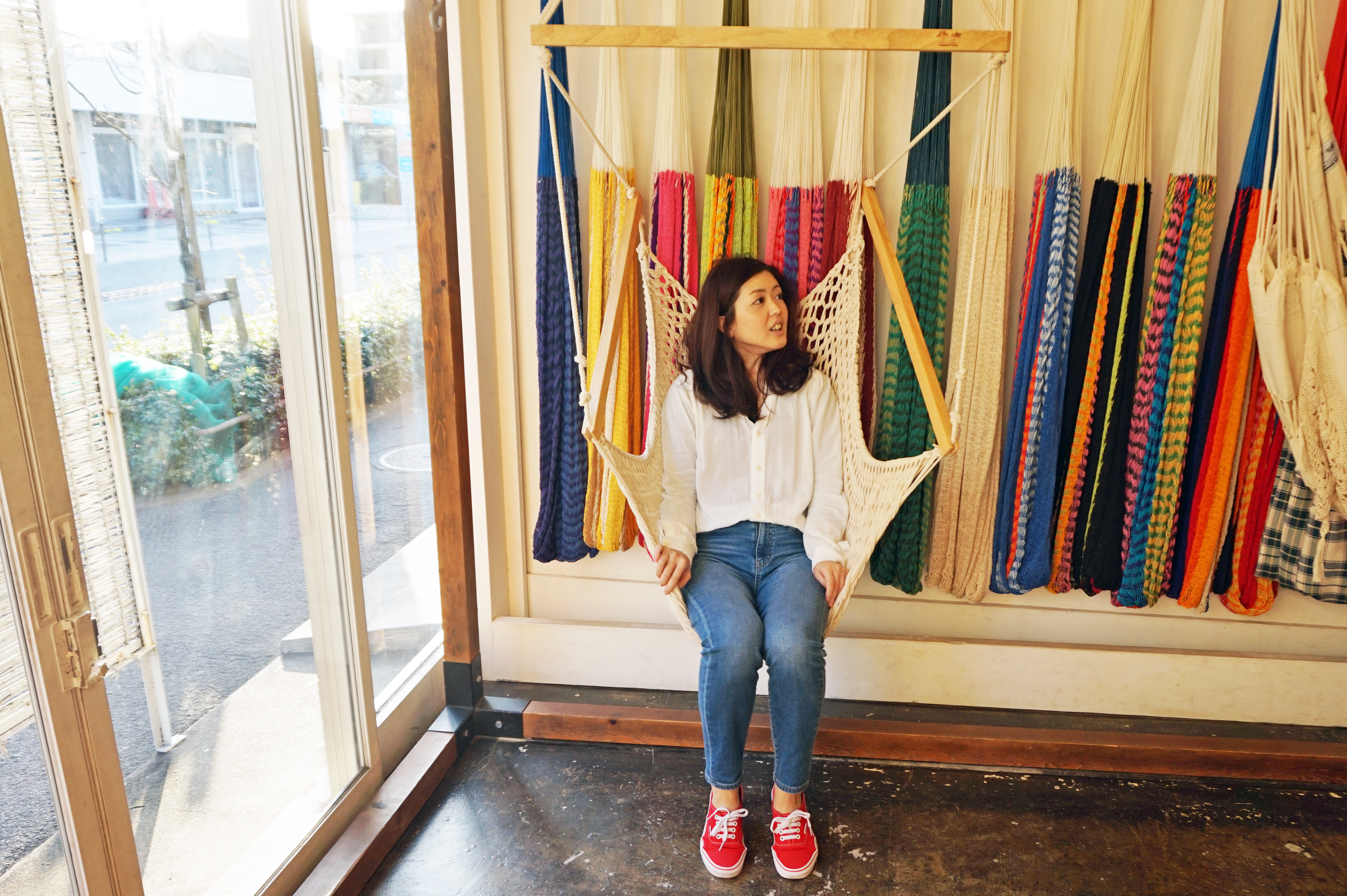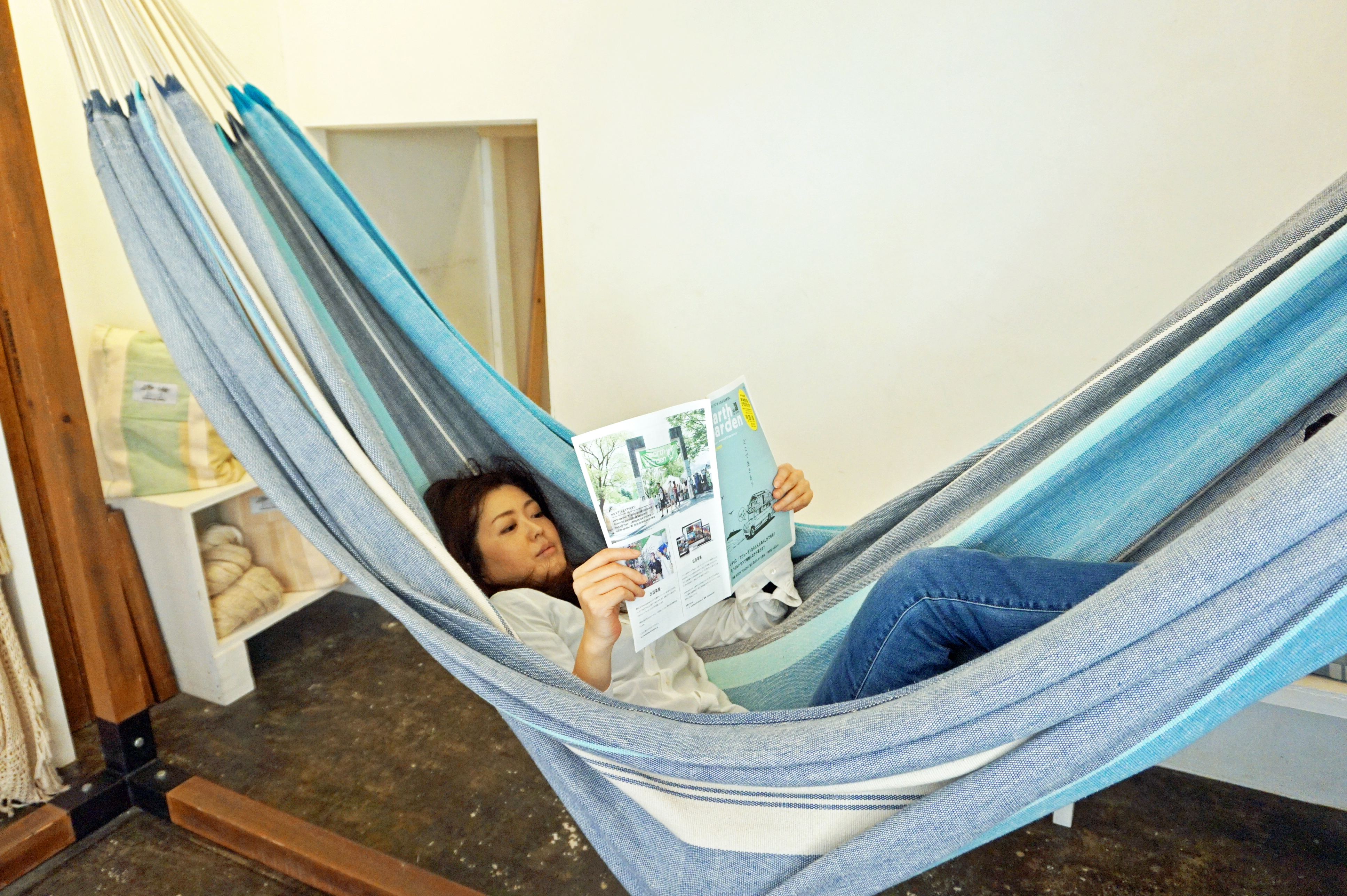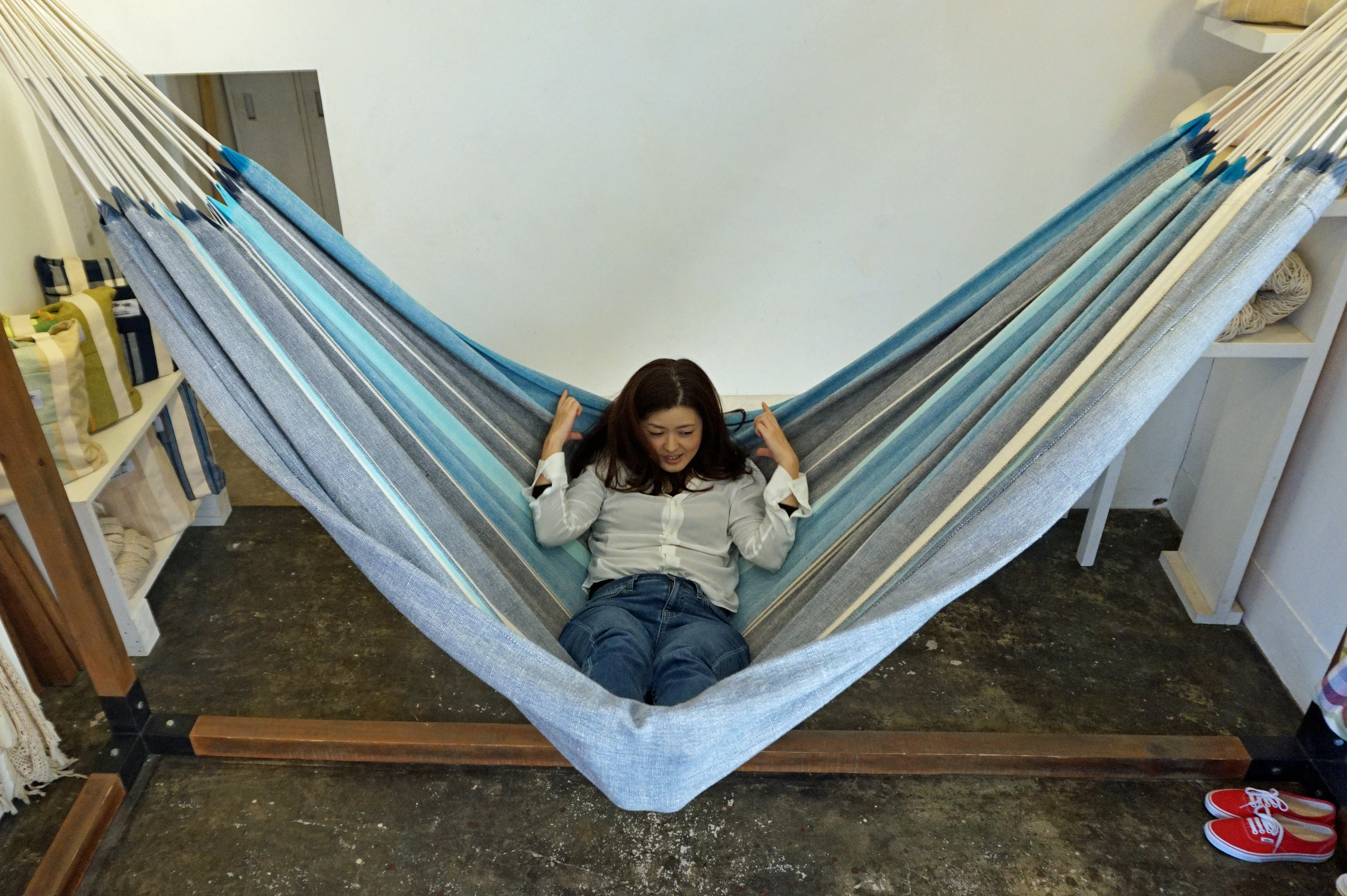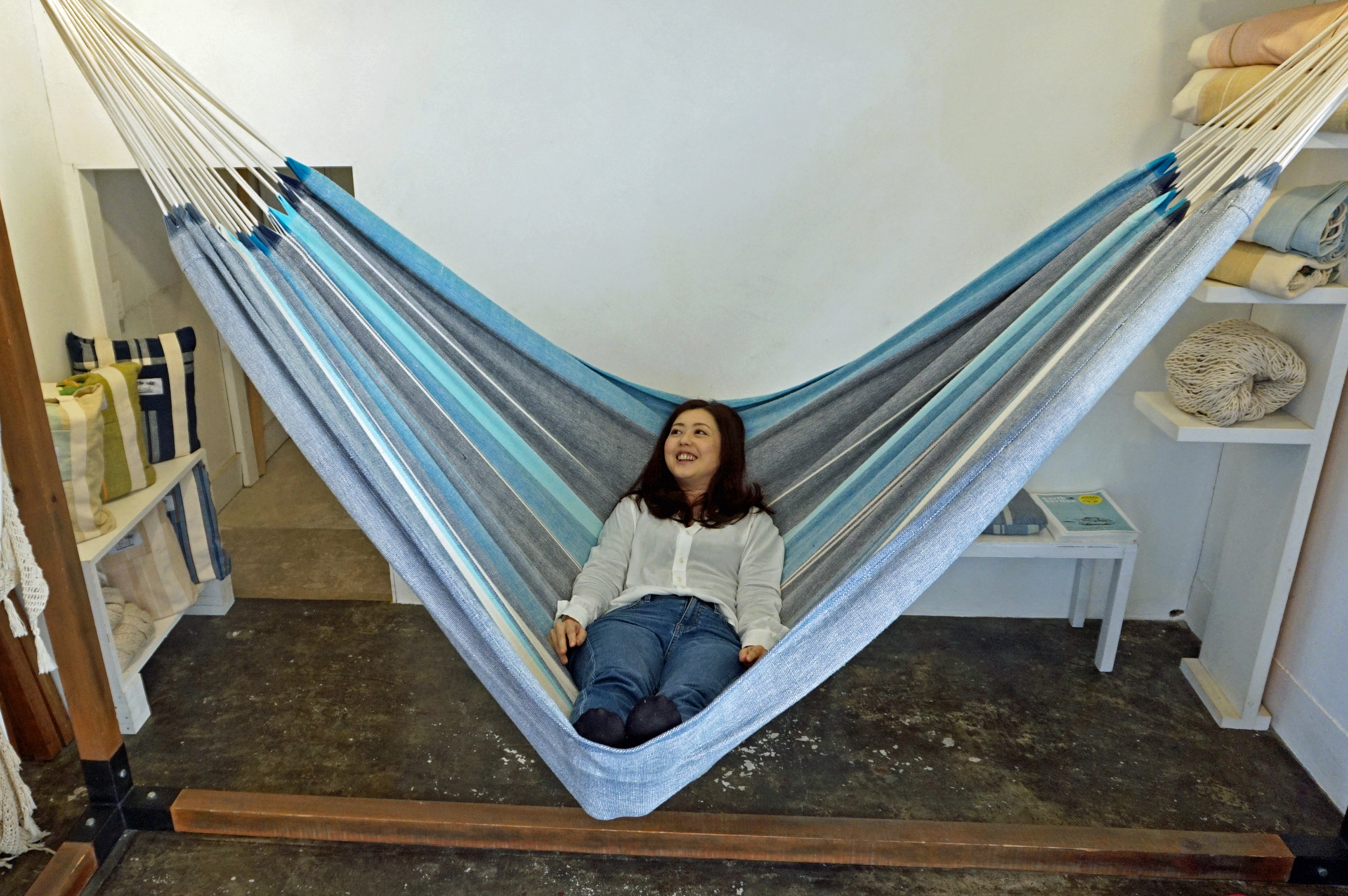 最近では、住宅メーカーがハンモックありきの設計で家を建てたり、座るソファや椅子がハンモックになったカフェができたりと私たちの生活の中に馴染んできています。ハンモックはアウトドアだけでなく、屋内の生活の中で十分楽しめるものなんですよ」