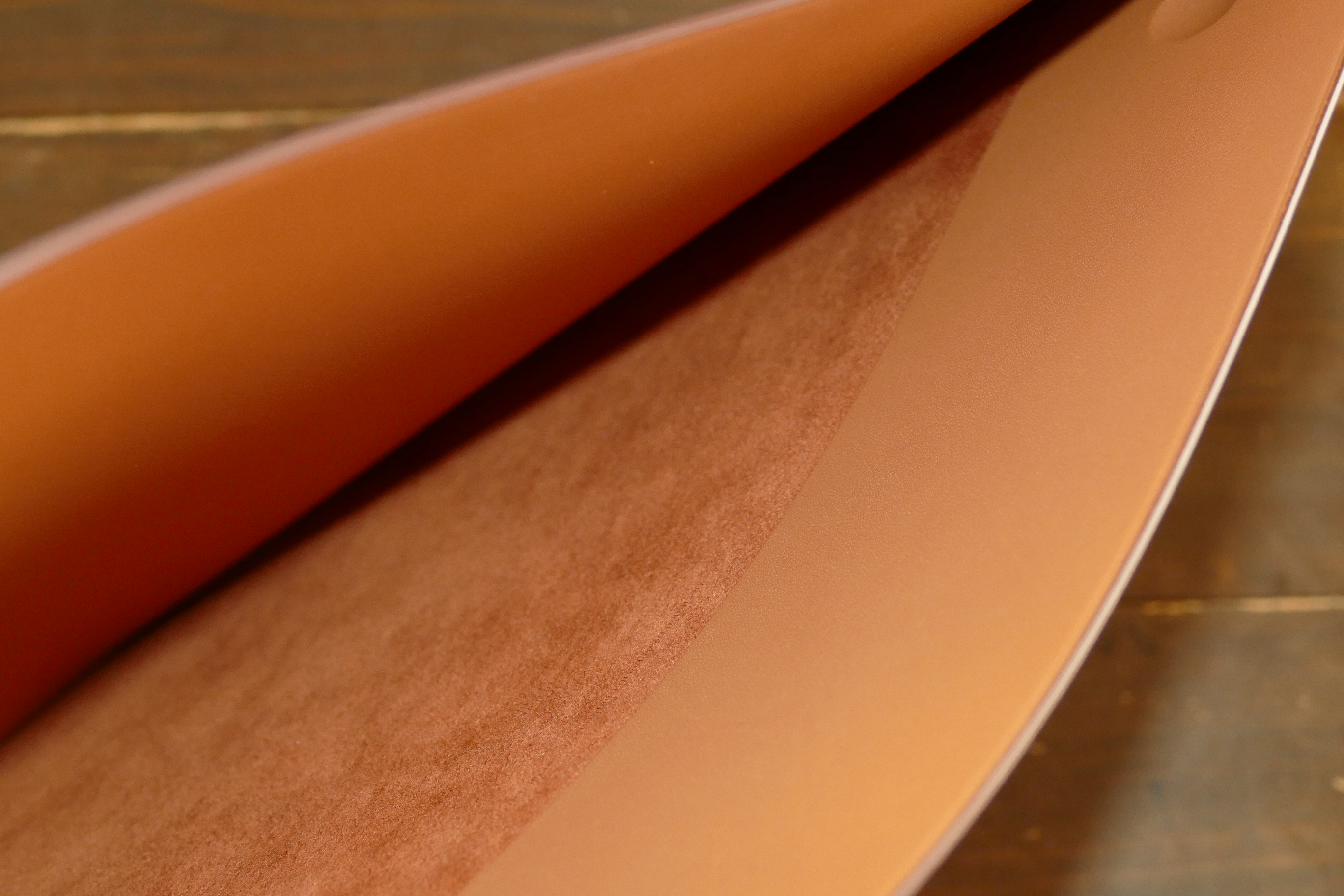 レザースリーブの内側を開いてみましょう。奥の部分の裏地には柔らかなマイクロファイバーが使用されていました。