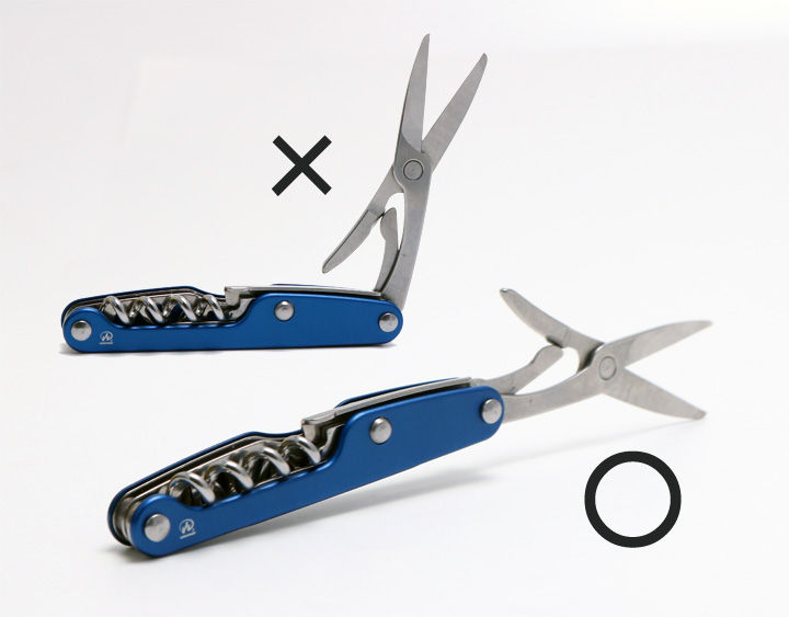 恐らく一番使うであろうハサミはスプリングサスペンションタイプ。ハサミも最大限展開しないとバネ板が引っ掛からず使えません。しっかりと展開して使いましょう。
