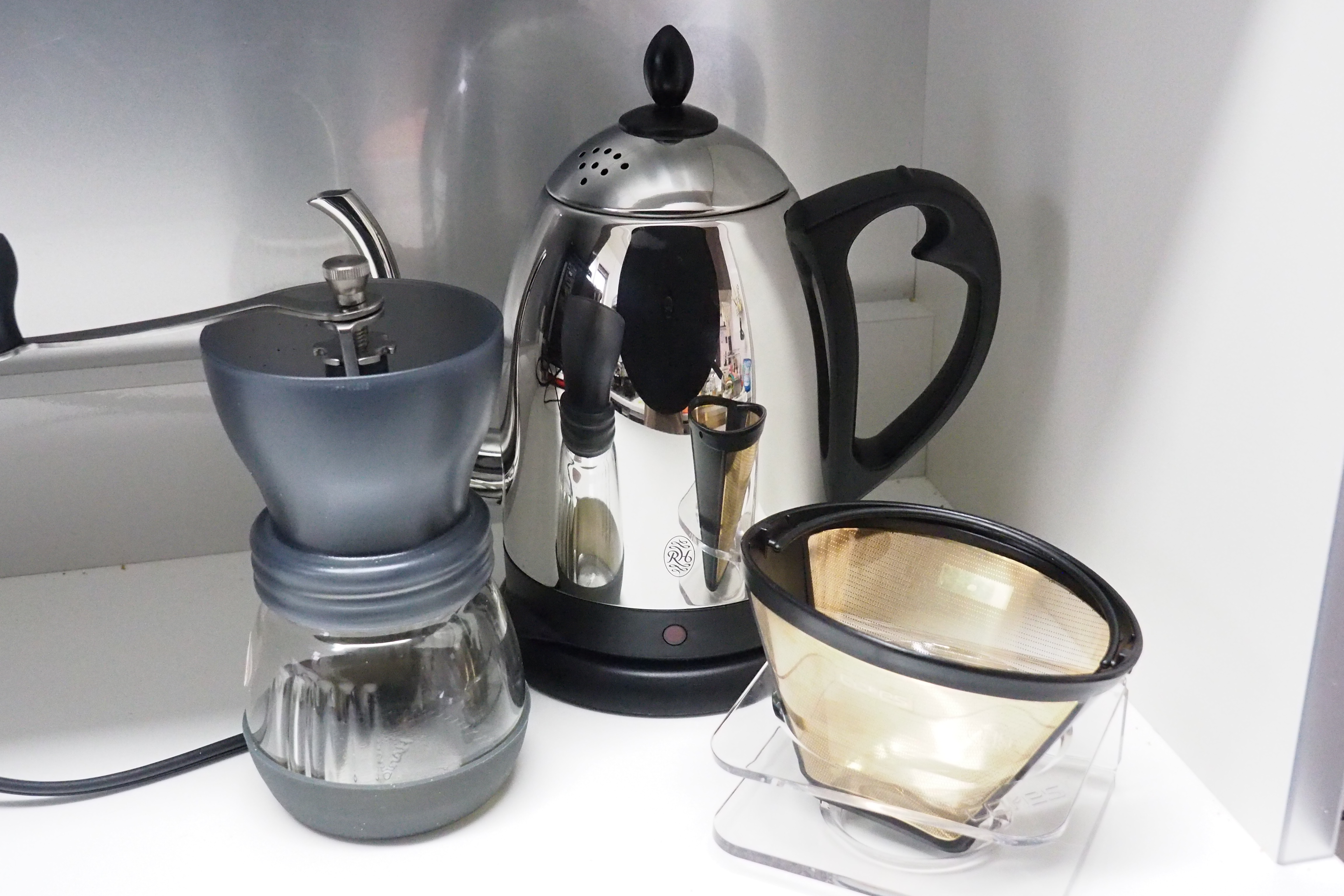 ハンドドリップのための三点セット。ミルとフィルター、ケトルがあれば美味しくできる。ミルは電動でもいいが、せっかくハンドドリップなら手動で香りを楽しもう。ラッセルホブスのケトルは実勢価格9060円