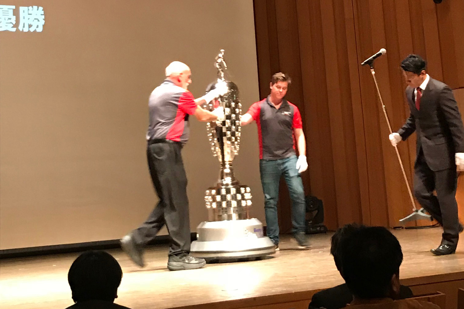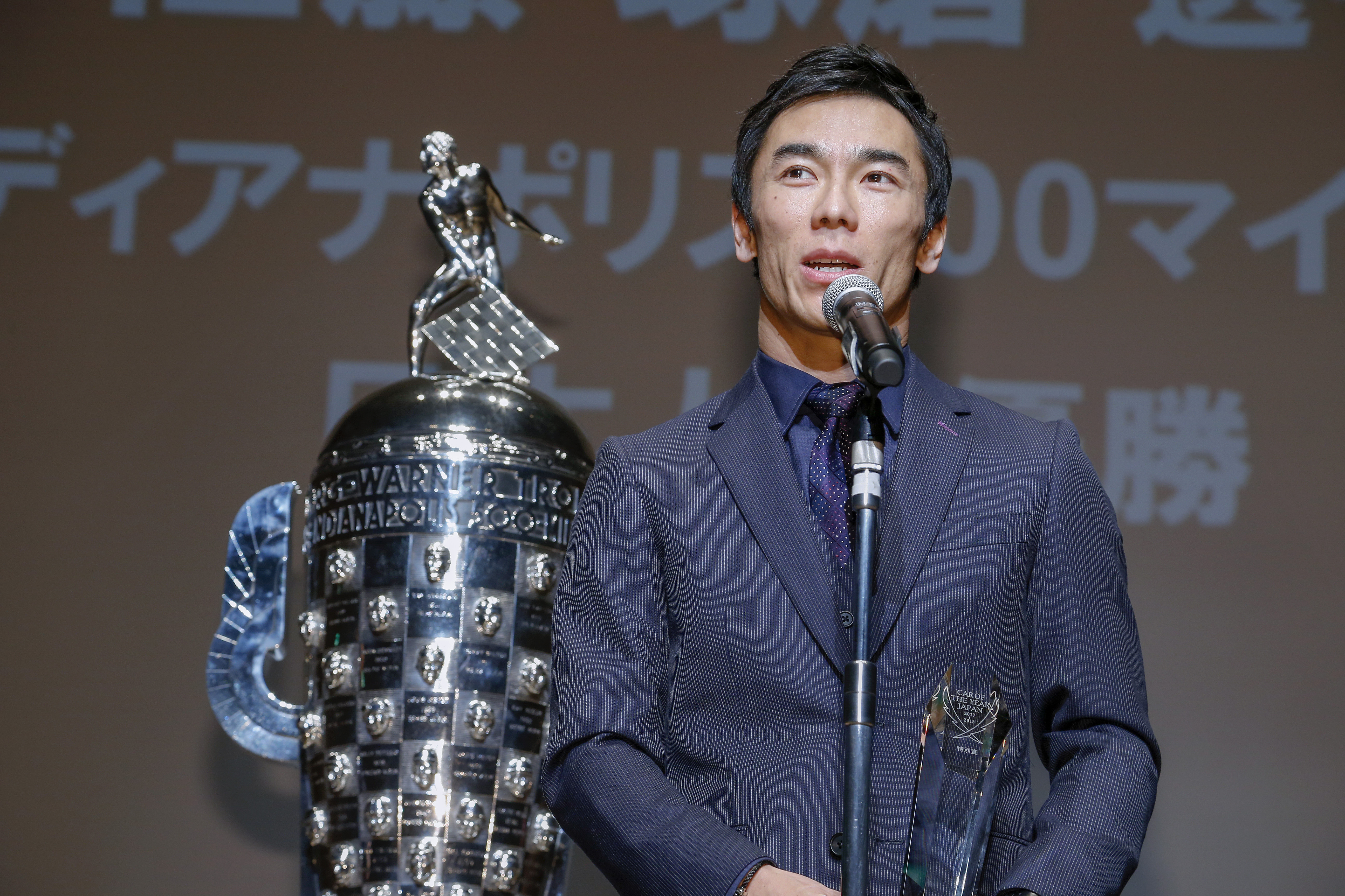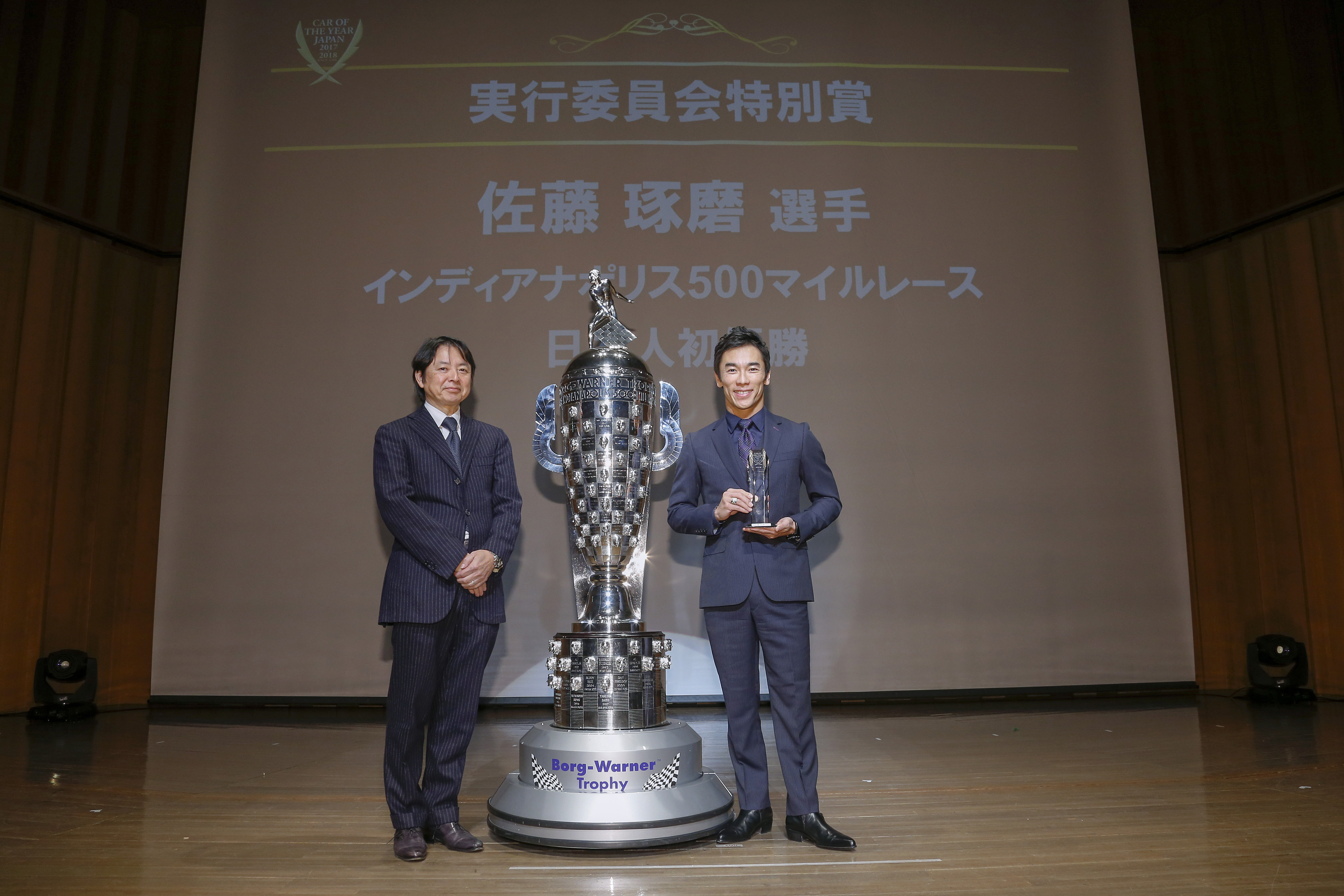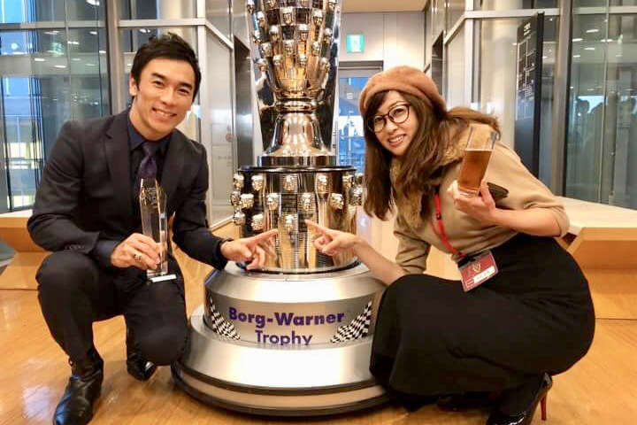 そして表彰会場には、佐藤琢磨選手とともに、日本初上陸となるインディ500優勝トロフィー“ボルグワーナー・トロフィー”も姿を現しました。