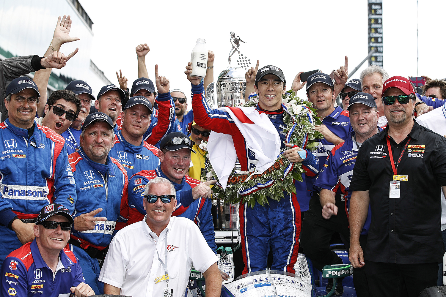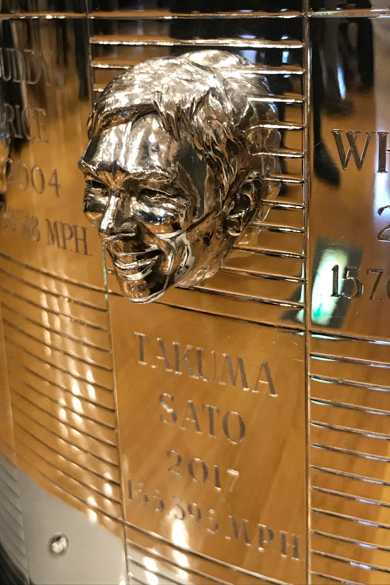 ちなみにトロフィーには、1911年の第1回大会ウイナー、レイ・ハルーン選手から順に、優勝ドライバーの“顔”の彫刻と名前が刻まれています。101回目となった2017年の勝者、琢磨選手の“顔”の彫刻は、トロフィー正面の足下に! 今後、トロフィーの写真が撮られるたびに、必ず映り込む絶好のポジションです。さすが“持っているオトコ”は違いますね。