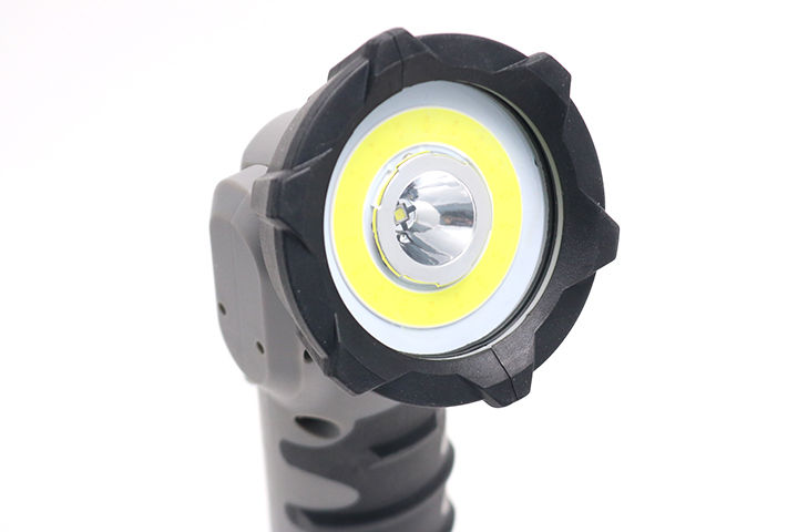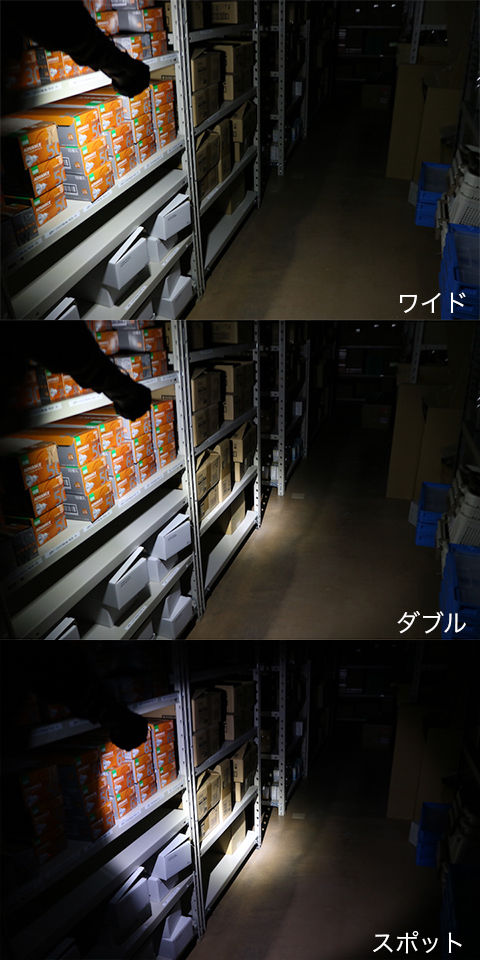点灯中にモードボタンをクリックすると、発光切替。クリックのたびにスポット→ワイド→ダブル→…と繰り返し移行します。明るさのモードは電源OFF時には記憶されませんが、この発光モードは記憶されます。例えばワイド照射のどの明るさで電源をOFFにした場合でも、次は必ずワイド照射のLOWからのスタートになります。スポット照射、ダブル照射でも同様に、次回点灯時はその照射モードのLOWから。ワークライトとしては合理的です。