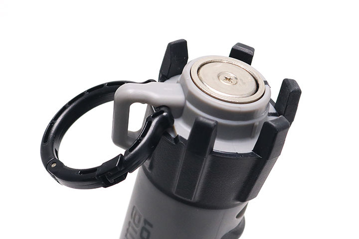 このテール部分には、ツール落下防止ワイヤーのフックをそのままかけられる大型のランヤードリング、さらに格納式のカラビナ、これらを使用中もマグネットスタンドが可能なようにデザインされた周囲のデザインなど、現場主義のTAJIMAならではの見所が満載。