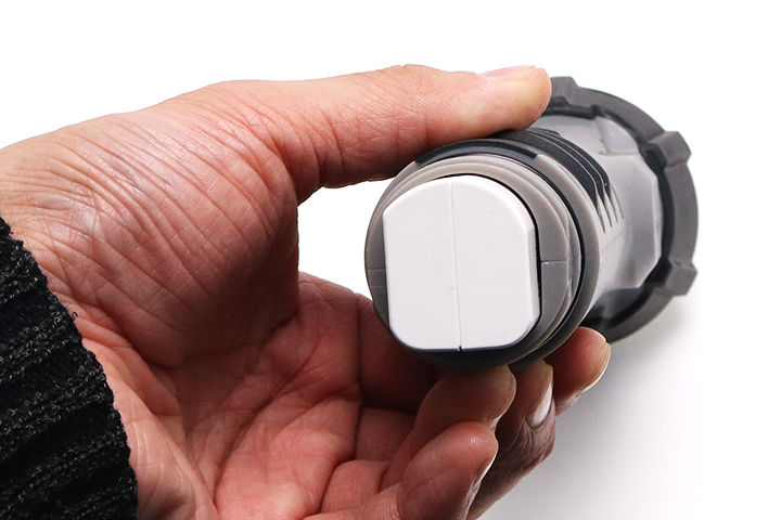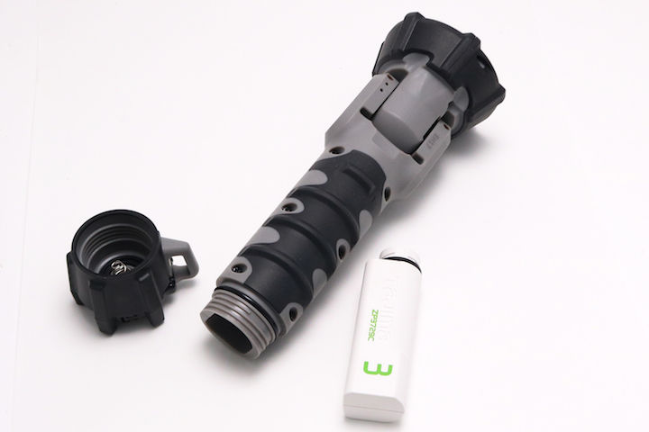 内蔵しているのは大容量のリチウムイオンバッテリー。テールキャップを回し、白い電池を強めに引っ張れば抜き出せます。