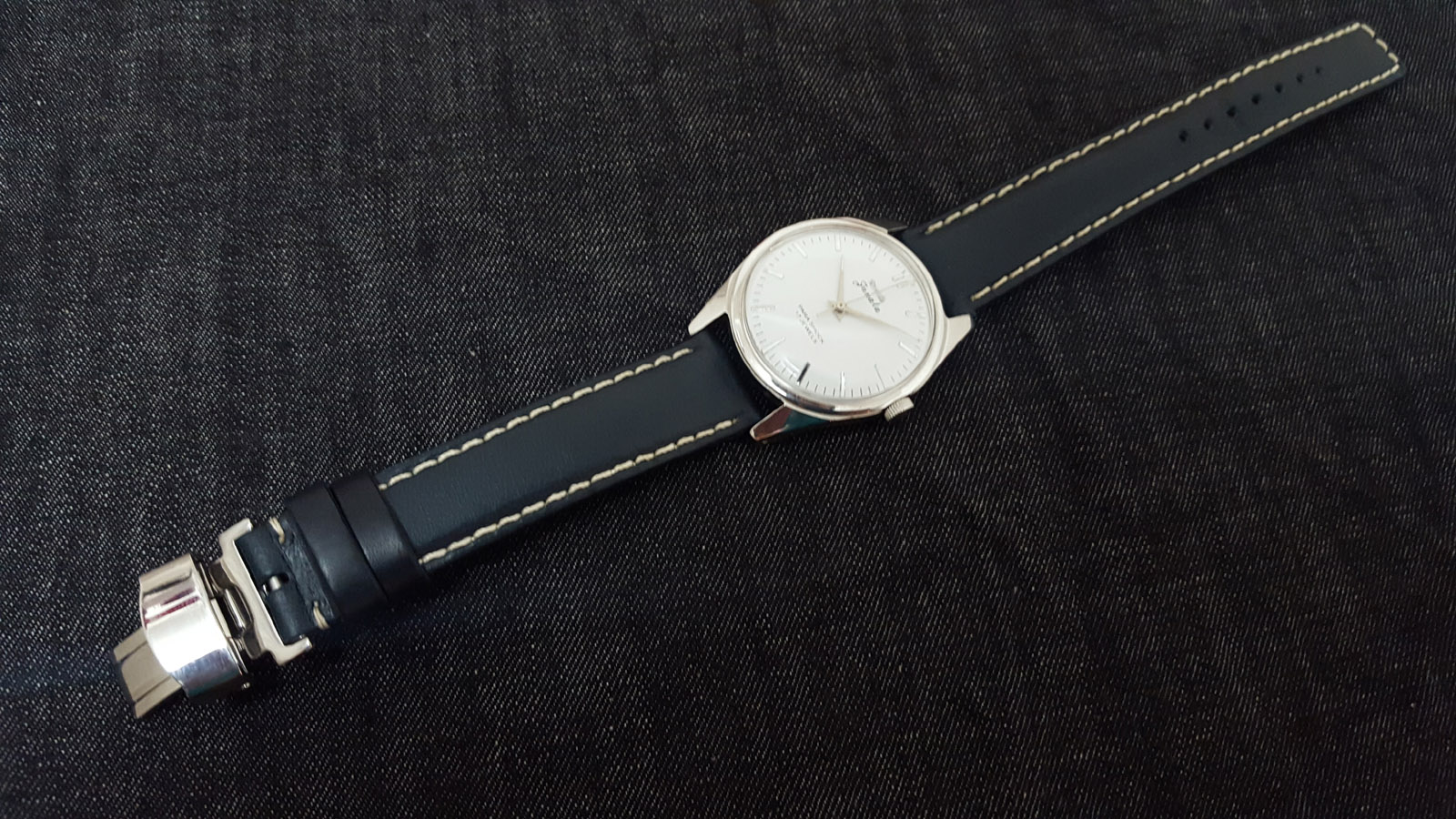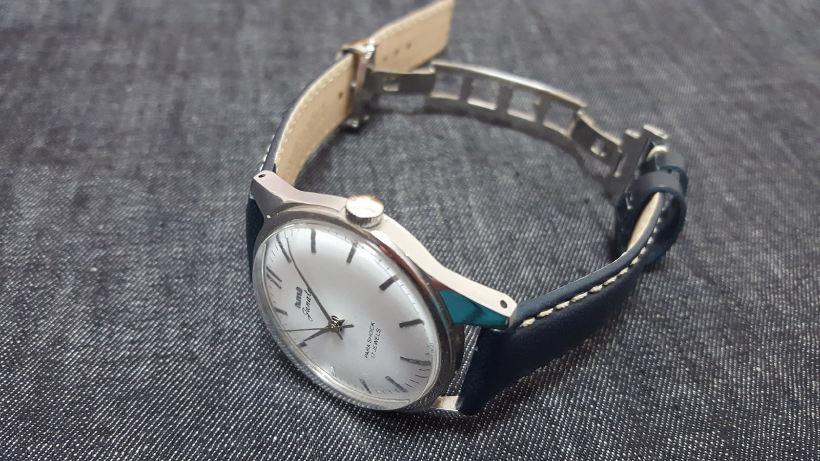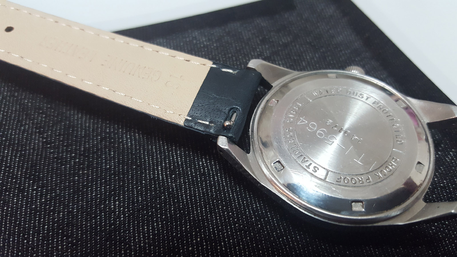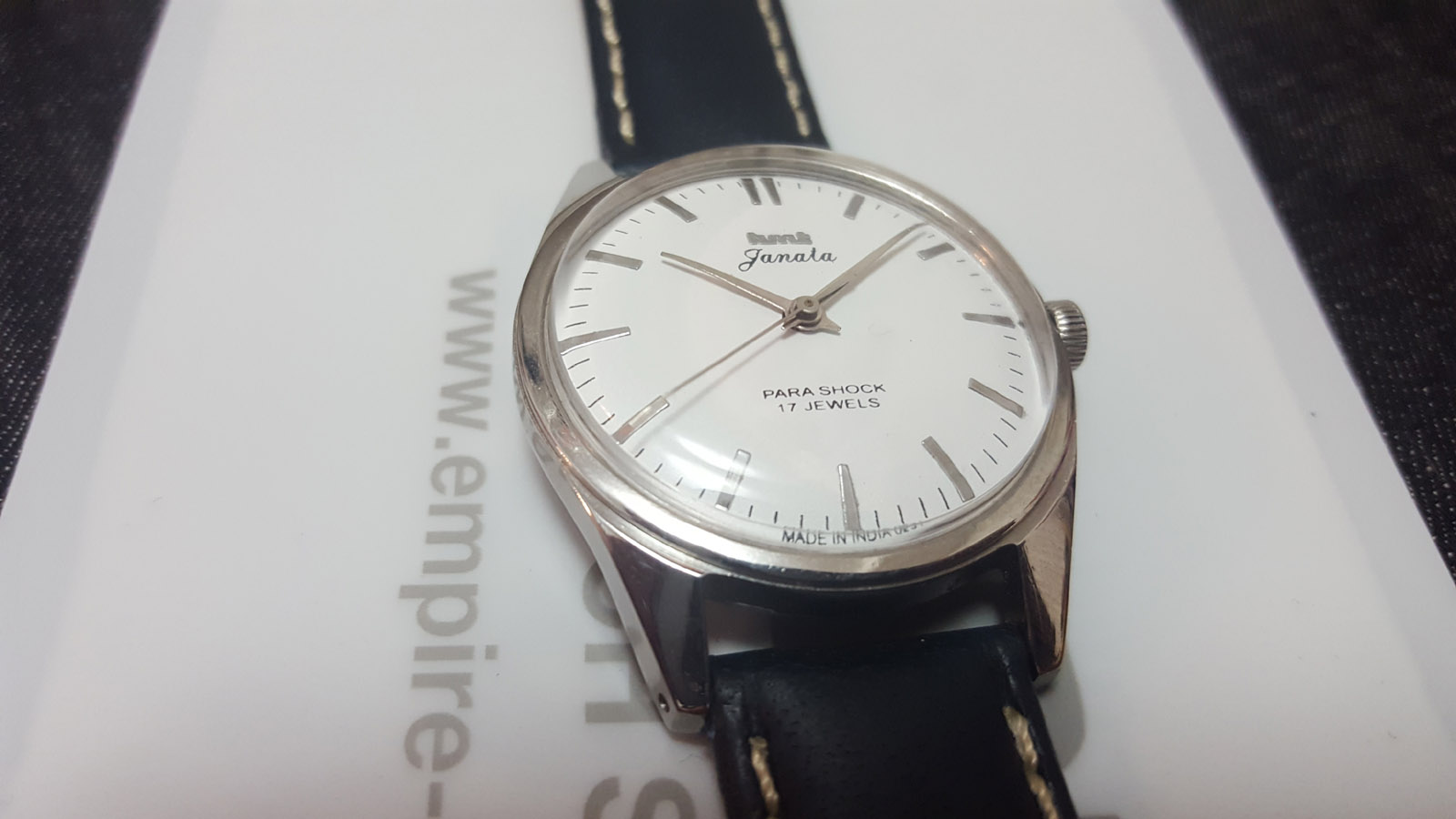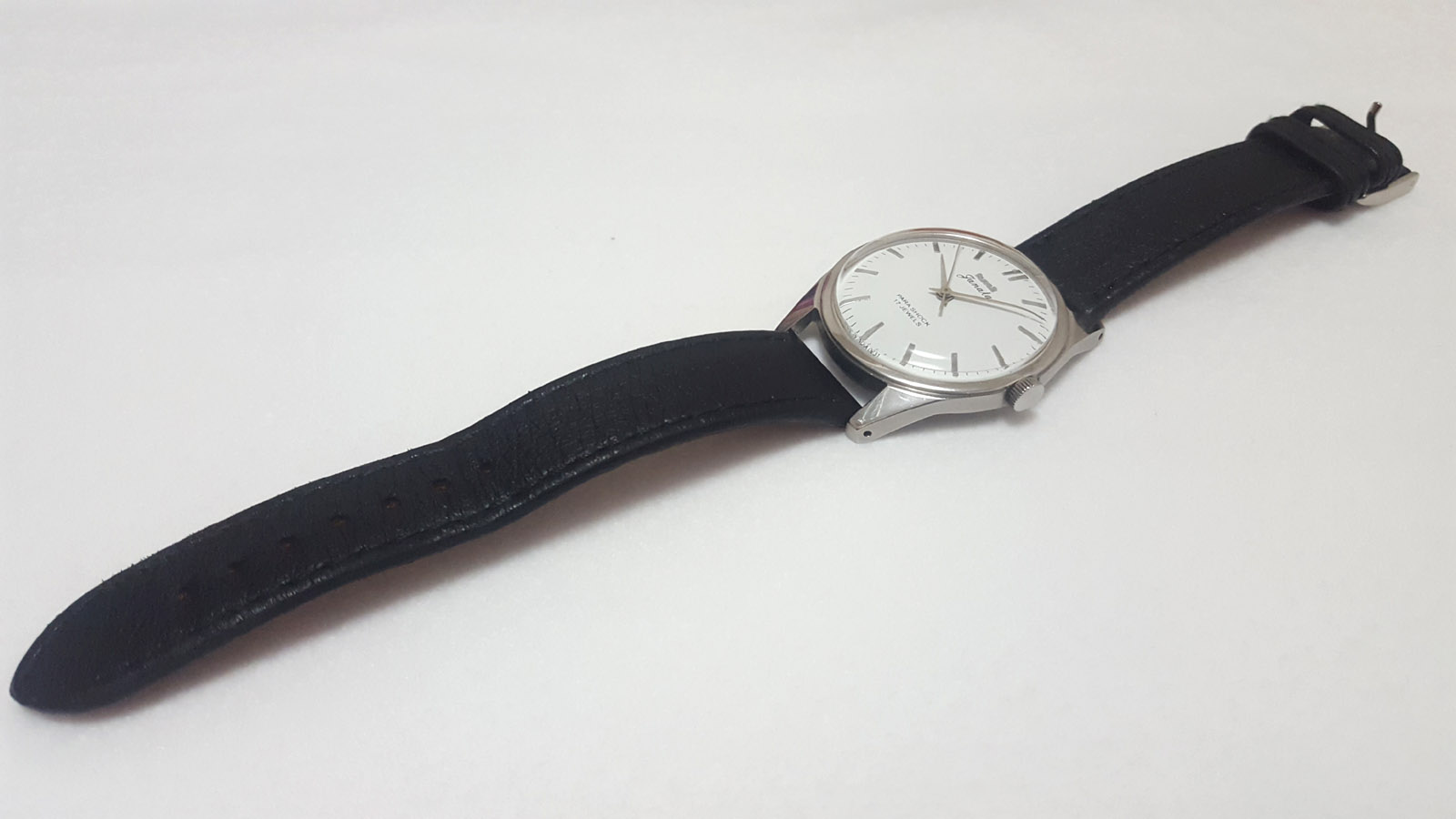 今回、バンド交換をするのはコチラの腕時計。先日、記事にも書いたインドのレトロ&シンプルなチプメカ腕時計「HMT」で、けっこう以前に「ヤフオク!」で落札した白文字盤のタイプです。白い文字盤はスッキリしたデザインで他の色とも合わせやすいのがイイですね。そしてソコに付いている黒い革バンドはそれなりに年季も入ってます。