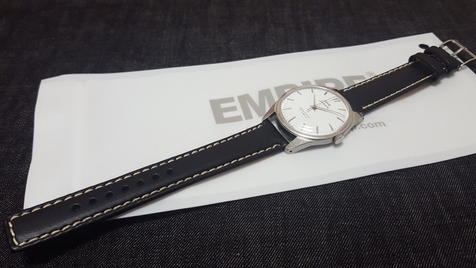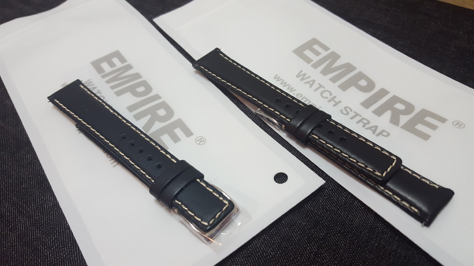 コチラは12月2~10日まで開催されていた楽天のスーパーセールで「腕時計ベルトの専門店 EMPIRE」さんから購入しました。セールのため、ひとつ999円(税込)。通常時の価格は3780円(税込)なので、かなりお得ですね。調子に乗って黒と紺のふたつを買いました。ショップ名の入ったオリジナルのオシャレなパックに封入されていて、安っぽさは感じられません。