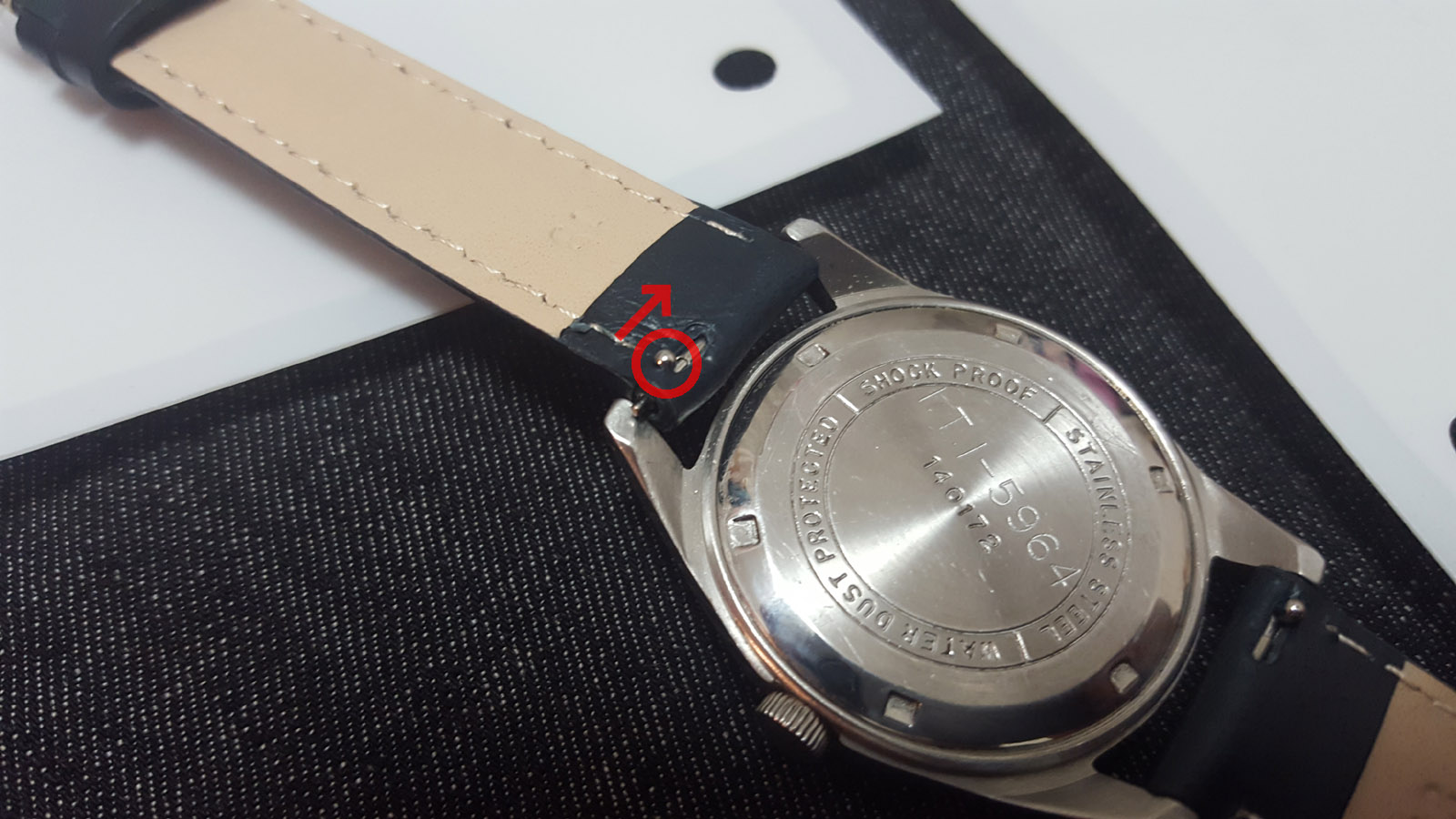 世の中の腕時計の多くは革製、金属製を問わず、このように“バネ棒”によってバンド部分が接続されていて、ココの幅さえ合えば何だって付けられるような作りになっています(金属製バンドの場合はフラッシュフィット部分の形状の都合もありますが…)。