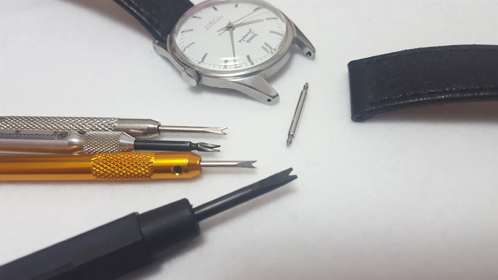 バンド交換には、この画像に並んでいる専用の工具、先端にV字の切り込みが入った“バネ棒はずし”が必要ですが、コツさえつかんでしまえばけっこう簡単に取り外しできます。とはいえ、中には「こうゆうの苦手…」という方もいるでしょう。そんな人でも気軽にバンド交換の楽しさ味わえるのが、今回ご紹介する時計バンドです。