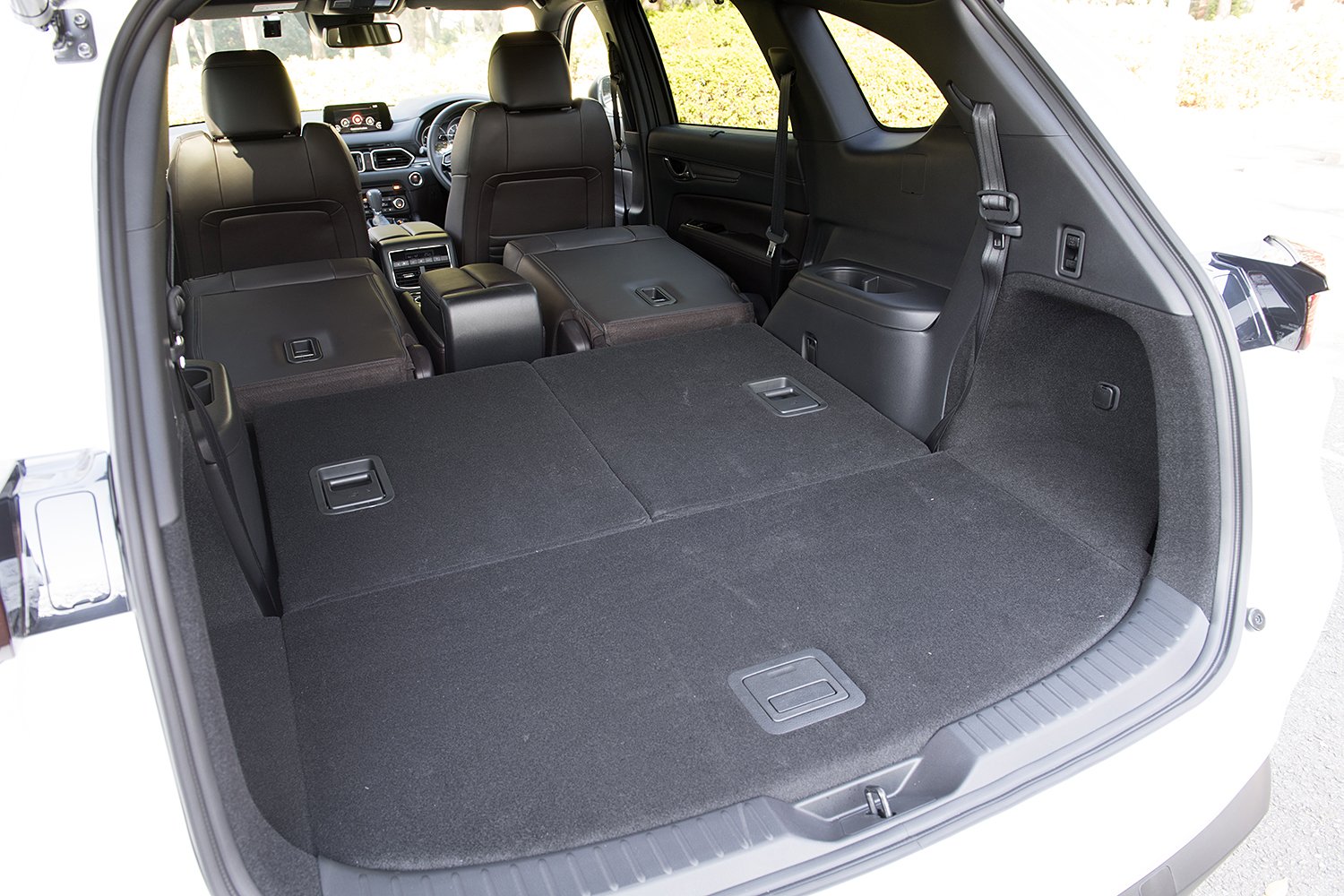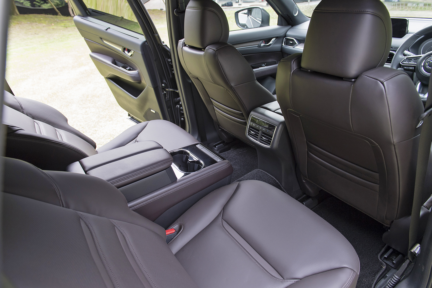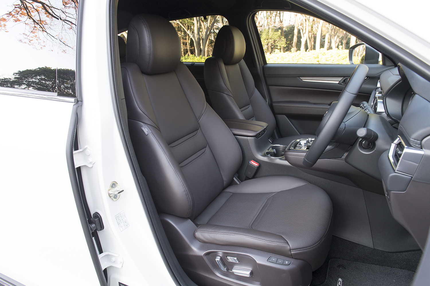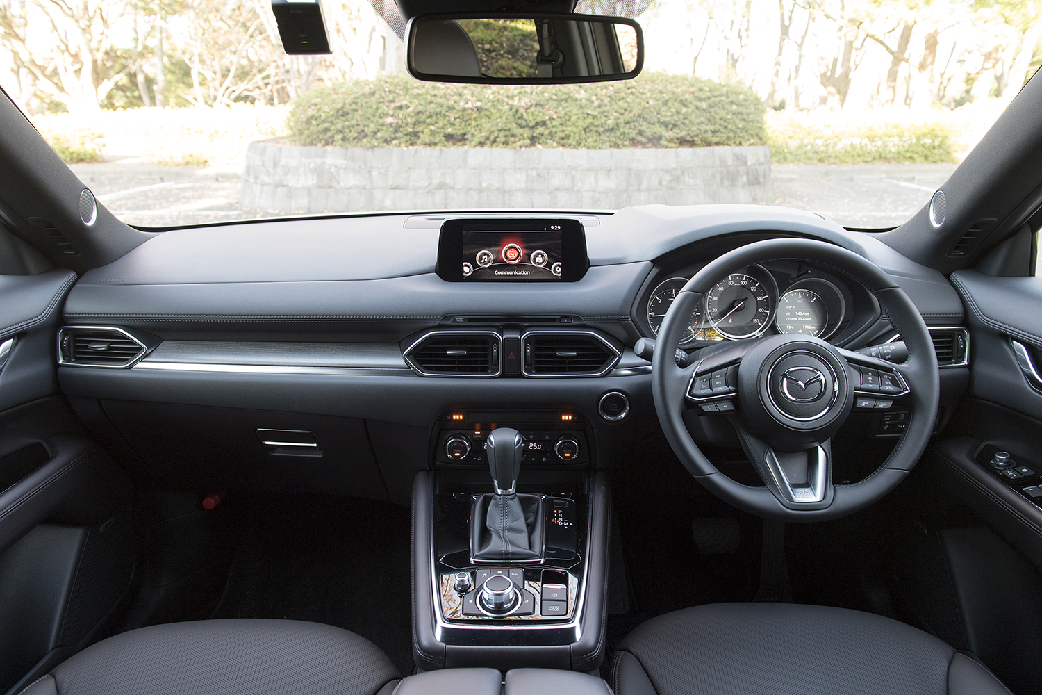 とはいえ、ドライバーズシートに収まると、メーターまわりや各操作系の配置など、眼前に広がる景色はCX-5と“ほぼ”共通。しかし、センターコンソール周辺の形状や、ダッシュボードにあしらわれる本木目パネル、そして、シートの感触などはCX-5とは異なり、フラッグシップSUVふさわしい質感やデザインへと改められています。この辺りの巧みさには「マツダやるなぁ…」と思わず“ニヤリ”としてしまいます。
