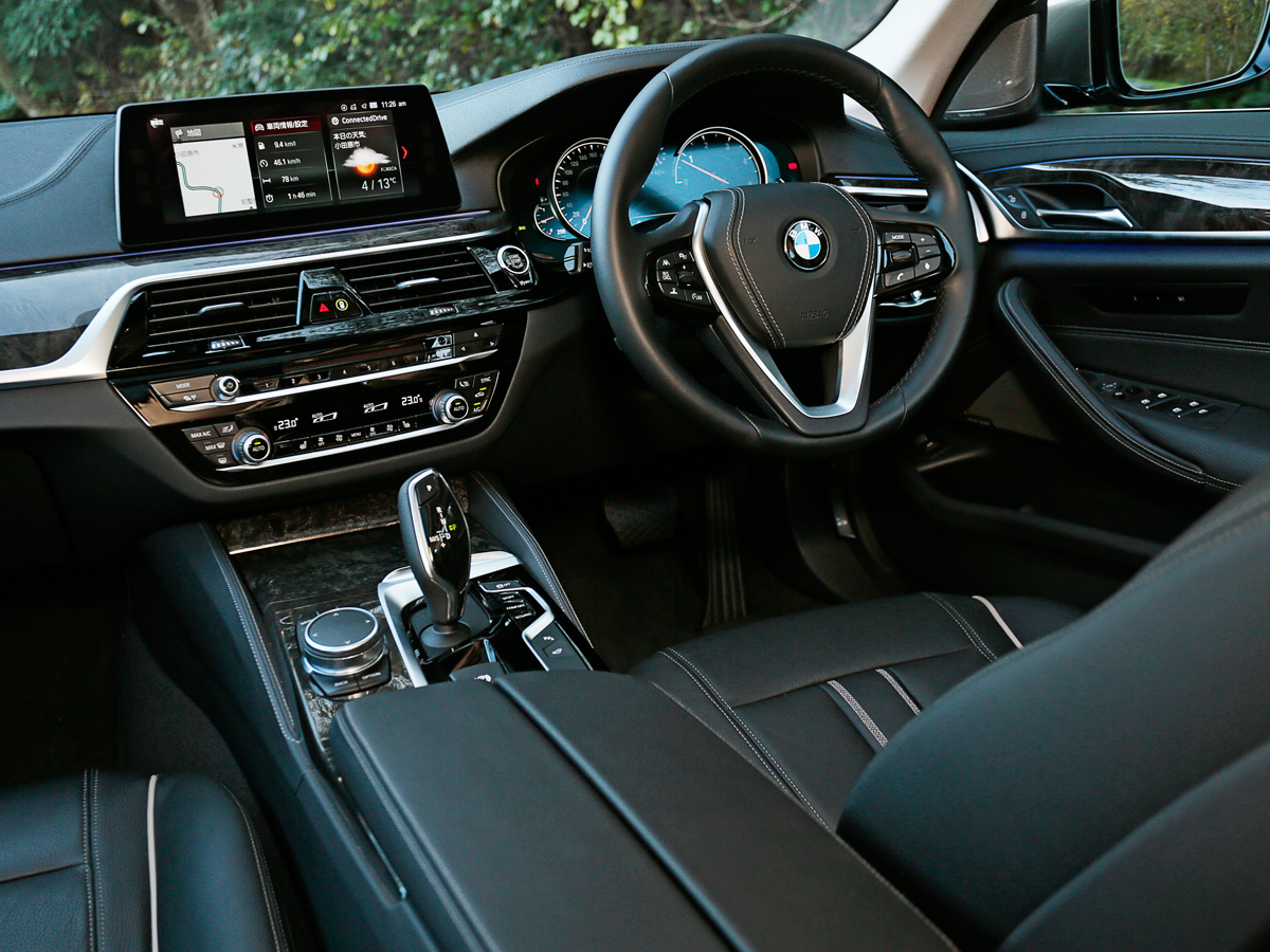 試乗車の523d ツーリング ラグジュアリーを例に取って、スタンダードとの違いを挙げてみましょう。外観では、キドニーグリルを始め、ボディ各部にクロームが配され、ヘッドランプがLED化されます。245/45R18のタイヤ&ホイールサイズはスタンダードと同じながら、より凝ったデザインのアロイホイールが与えられます。