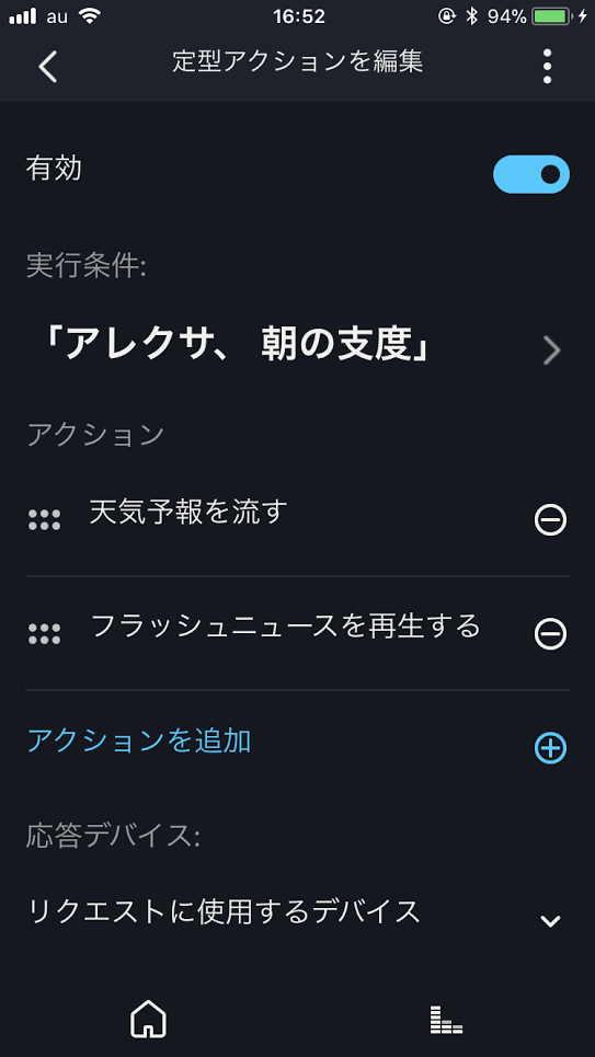 またリビングでよく使う機能としては、天気やニュースの確認です。ここで、毎朝のルーティーンとしてEchoを設定する方法があります。アプリ側で「定型アクション」の項目を選び、キーワードを決めて複数のスキルを呼び起こす方法。つまり、朝にドタバタしているとき、「アレクサ、朝の支度」と言えば、あらかじめ設定しておいたスキルが発動します。現在は「スマートホーム」「ニュース」「天気」しかプリセットされていないところが残念。指定の音楽をかけたり、スケジュールを読み上げてくれたりすると、もっと便利になると思われます。