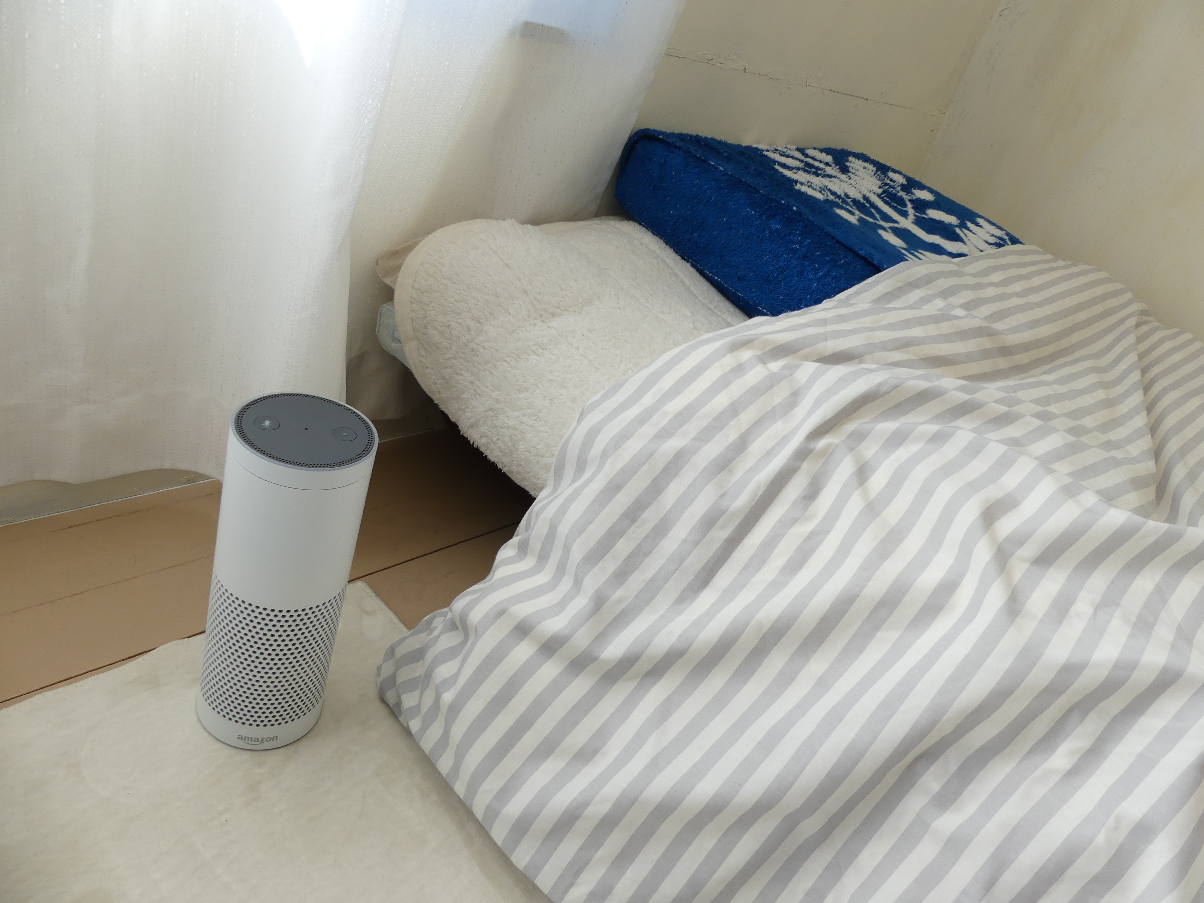 続いて、寝室での使用感を。ハッキリ言って、ここがベストな気がします。寝る前に音楽を小さめにかけて、「アレクサ、◯時間で音楽を止めて」とスリープタイマー。起床のため、「アレクサ、6時にアラームセット」としておけば、寝覚めも快適。Googleカレンダーと連動させておき、「アレクサ、今日の予定は?」と聞けば優秀な秘書としての役割も。まだ試していませんが、本モデルであるAmazon Echo Plusにのみ搭載されているスマートホーム・ハブ機能を使えば照明のオン・オフもできます。