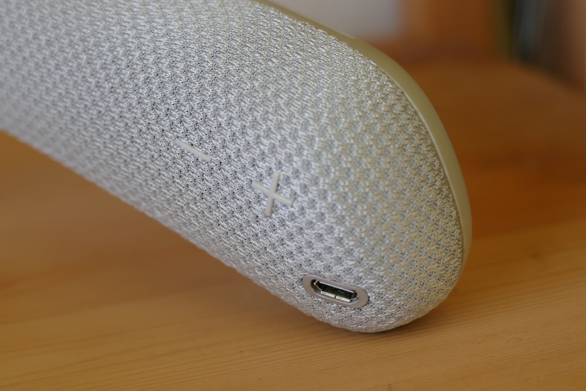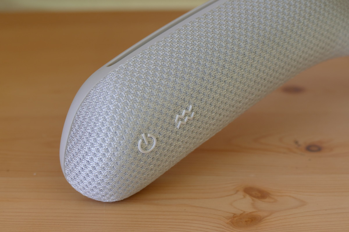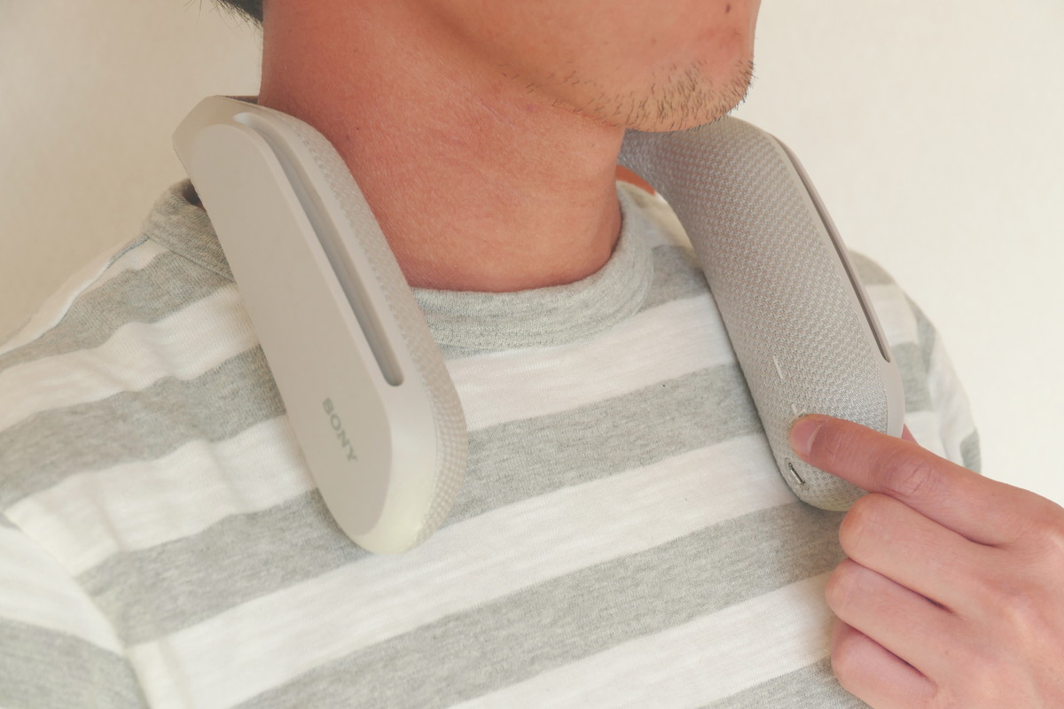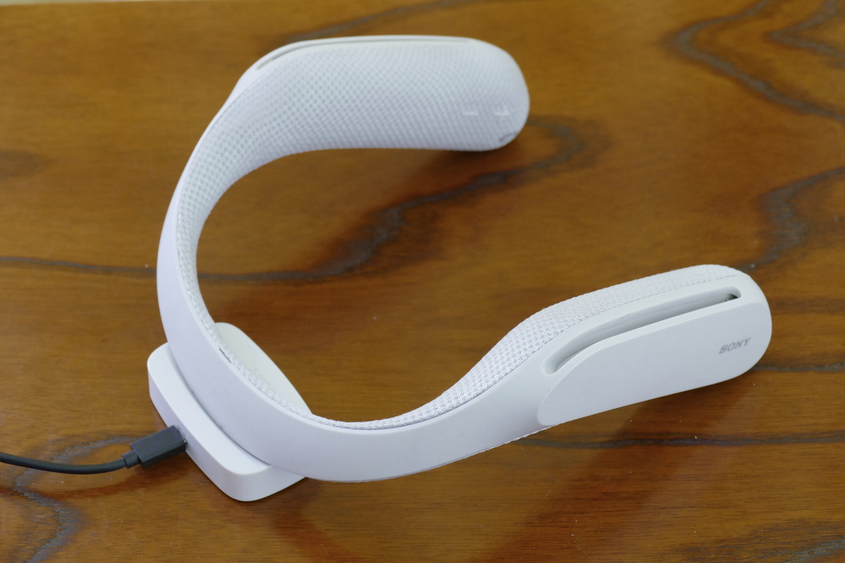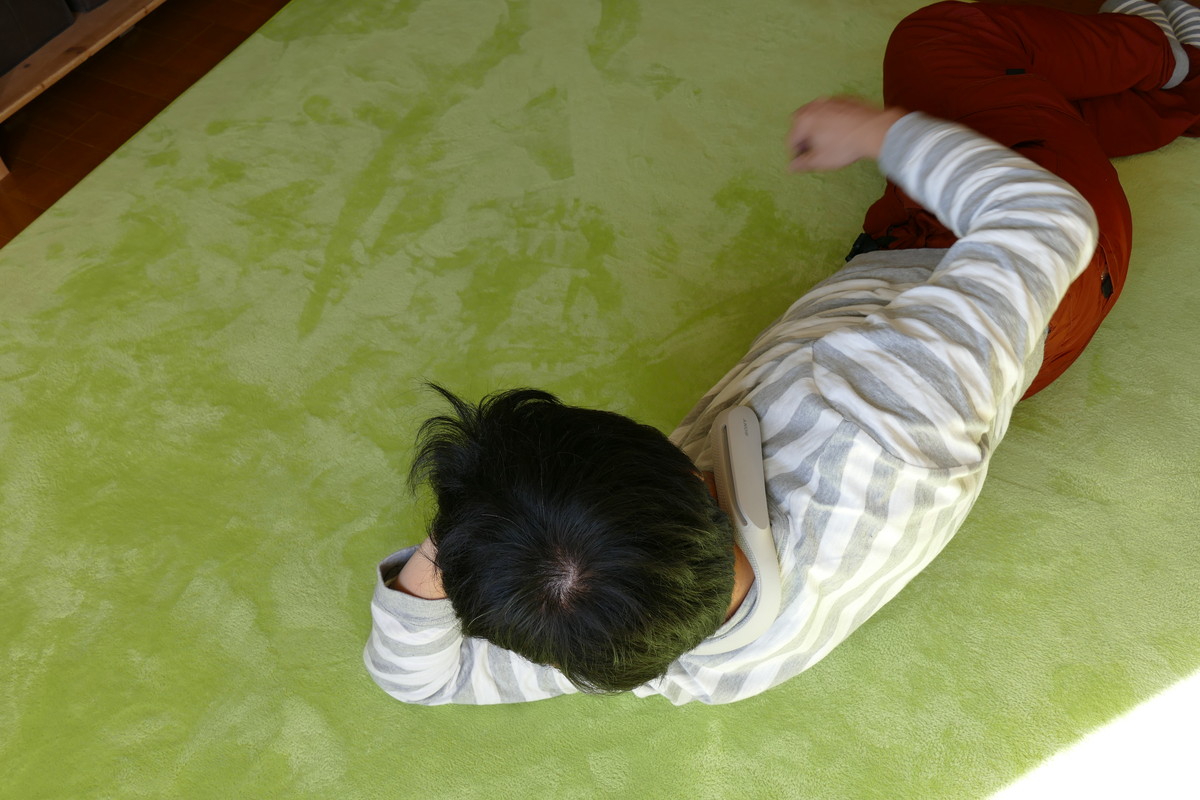 ちなみにゴロ寝状態での使用も意外にイケます。もちろん、仰向けになれば首から外れてしまうものの、うつ伏せや肩肘枕の姿勢なら大丈夫。寝転んでリラックスした姿勢でも音声だけは耳元でハッキリと聴き取れました。本体は約335gですが、そこまで重いとは感じません。