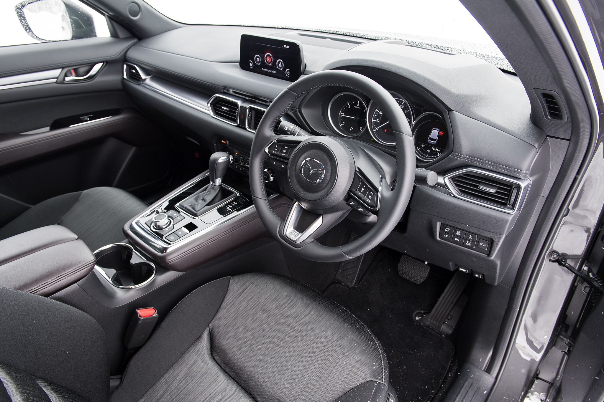 また、じんわりアクセルペダルを踏み込むものの、ソールの厚いスノーブーツやアウトドア用シューズでは感覚が伝わりづらいことがありますが、CX-8のオルガン式アクセルペダルは配置や踏み応えなど、扱いやすさも良好といえるでしょう。そんな操作性もチェックしつつ、市街地やカントリーロードなど、一般的な使い方に合ったコースを選び、テストドライブへと出掛けました。